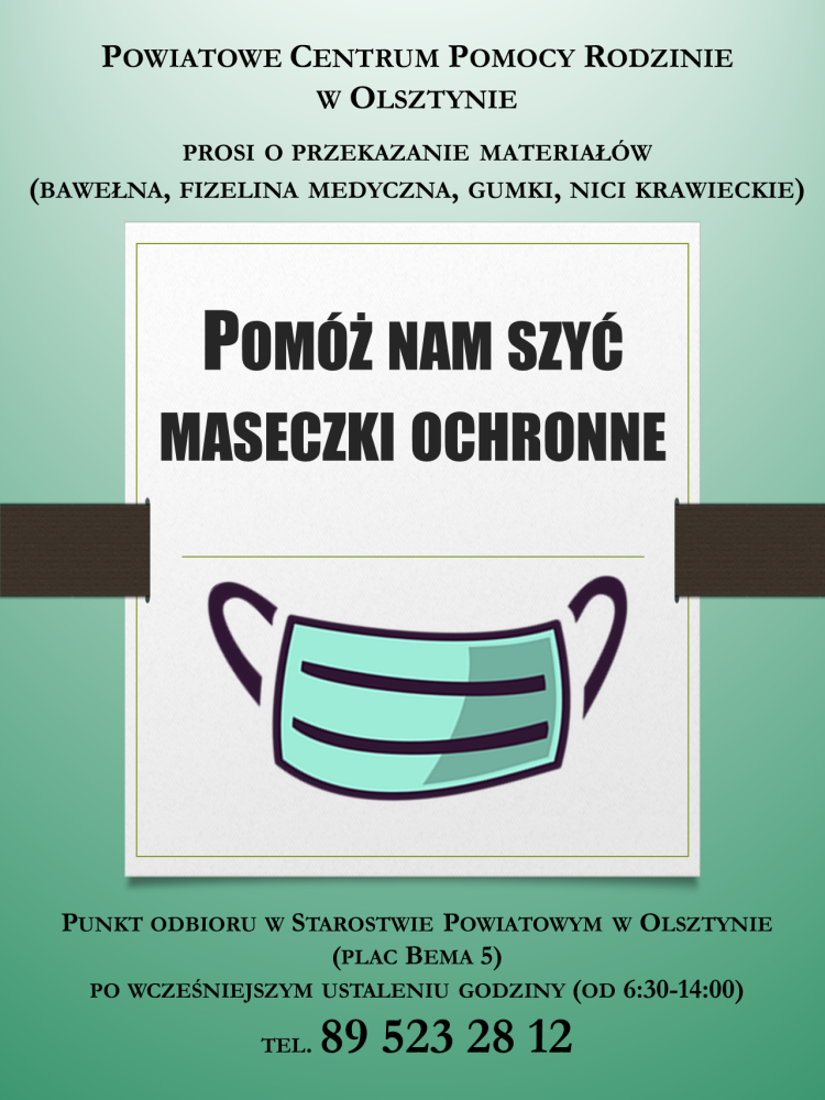 Kierując się ideą niesienia bezinteresownej pomocy Powiatowe Centrum Pomocy Rodzinie w Olsztynie przystępuje do akcji szycia maseczek ochronnych. Zwracamy się o wsparcie rzeczowe zarówno do osób indywidualnych, jak też przedsiębiorców.