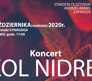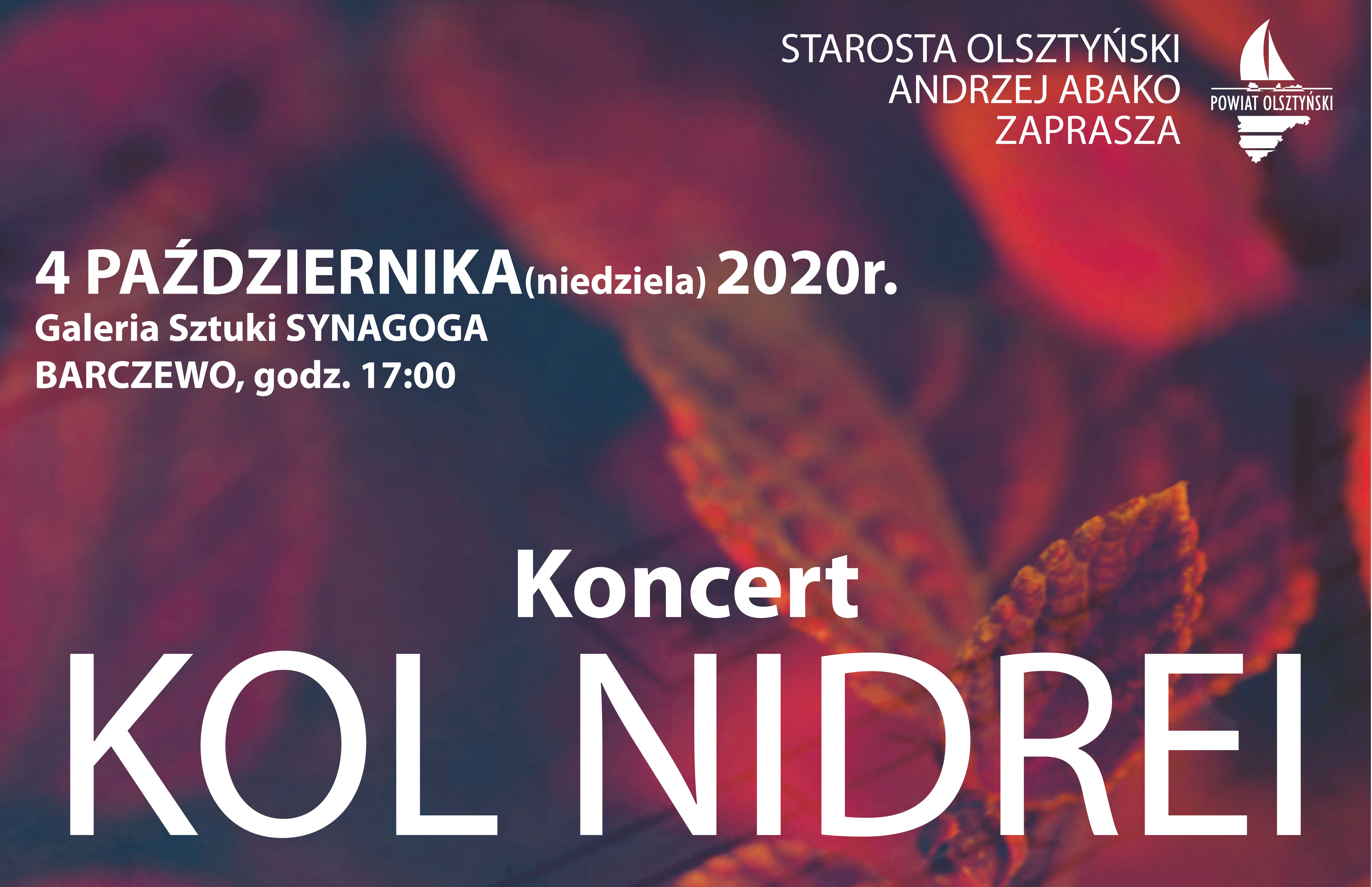 4 października o godz. 17:00 w Galerii Sztuki SYNAGOGA w Barczewie odbędzie się koncert KOL NIDREI w ramach XVI Międzynarodowego Festiwalu Kameralistyki Sacrum et Musica. Wystąpią: Capella Bydgostiensis, Michael Zukernik (Szwajcaria) - dyrygent, Anton Niculescu (Rumunia) - wiolonczela. W programie: P. Czajkowski, G. Mahler, B. Bartok, M. Bruch. Wydarzenie odbywa się pod patronatem Andrzeja Abako, starosty olsztyńskiego.
