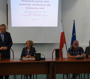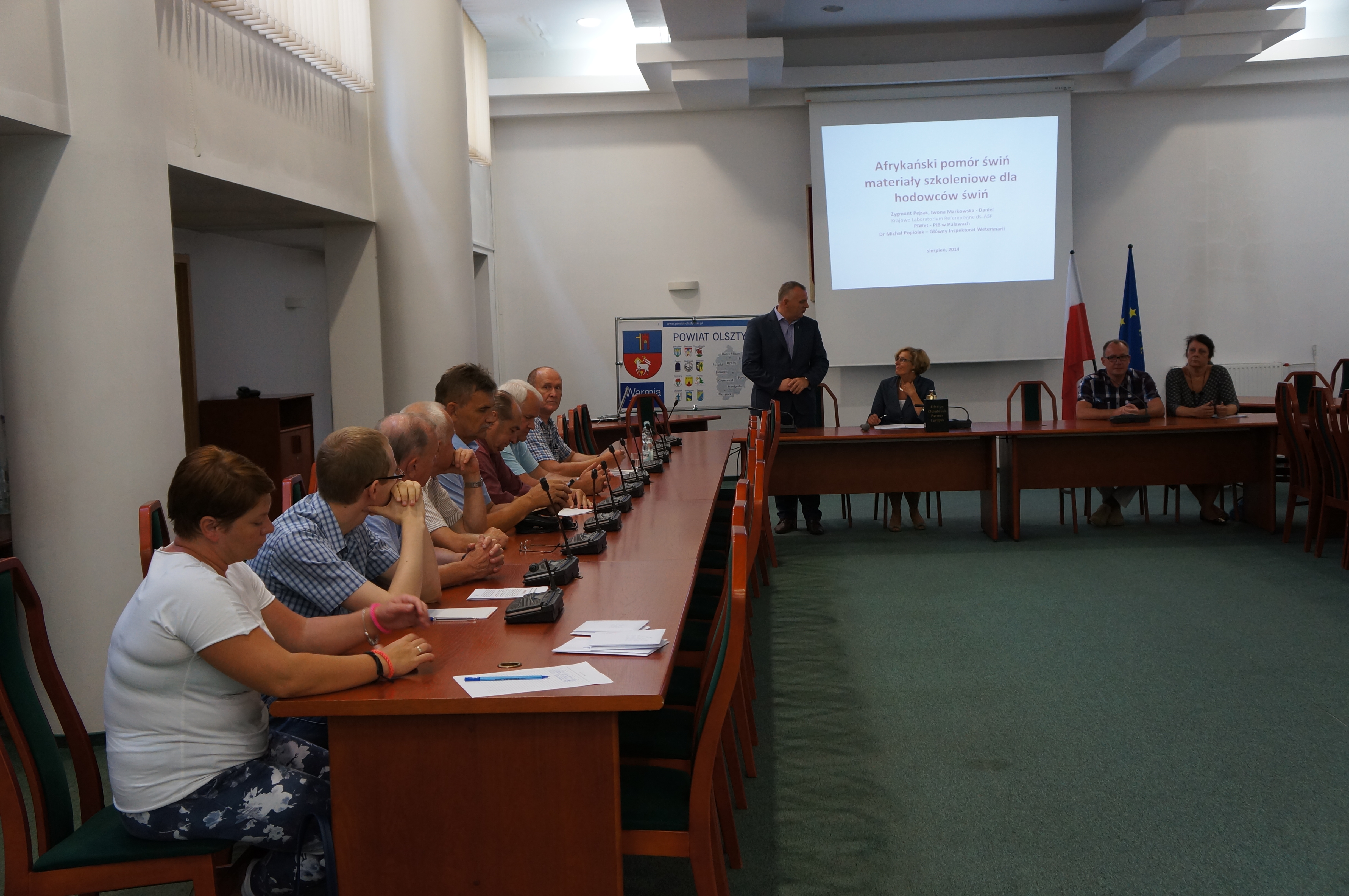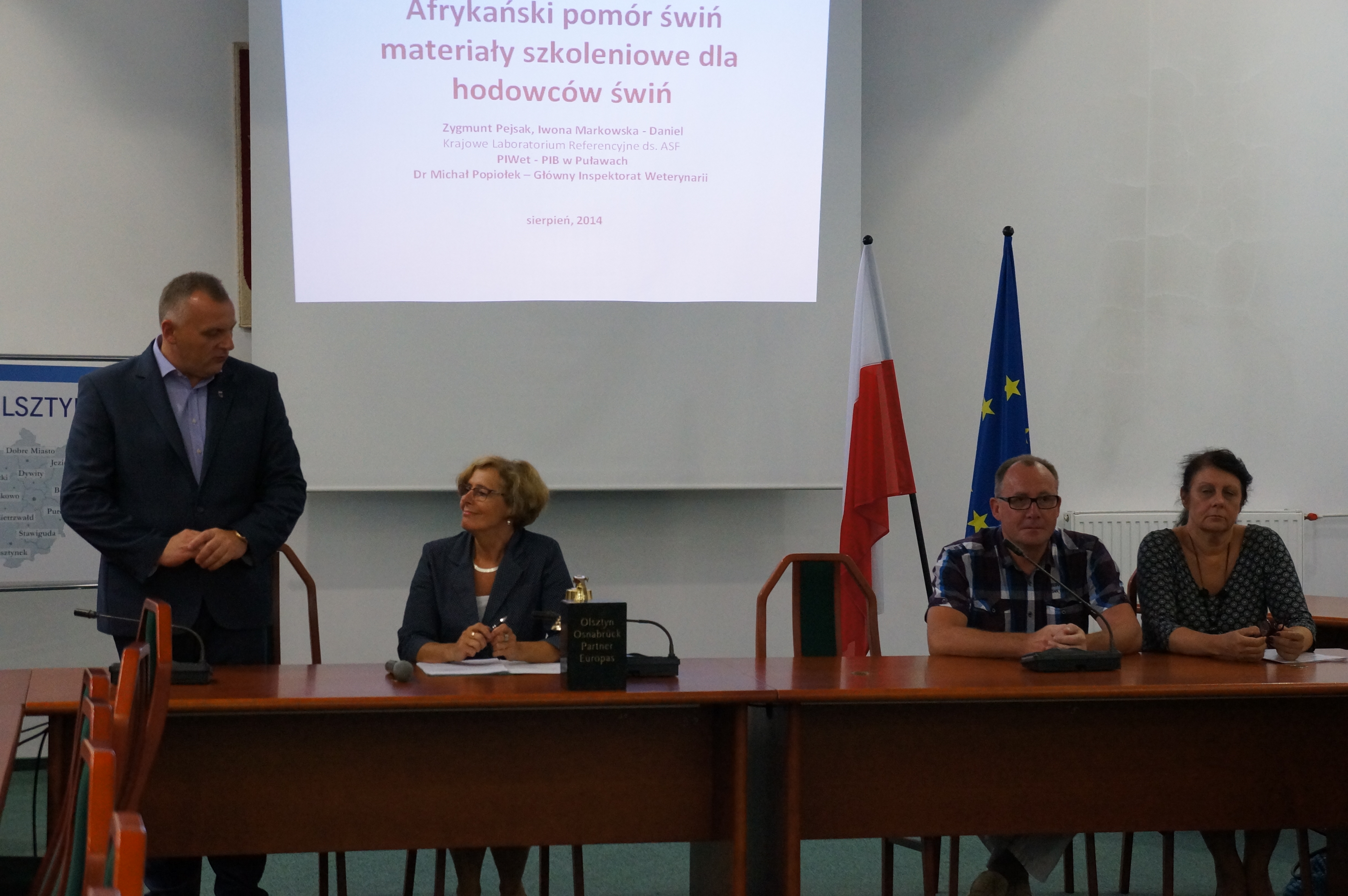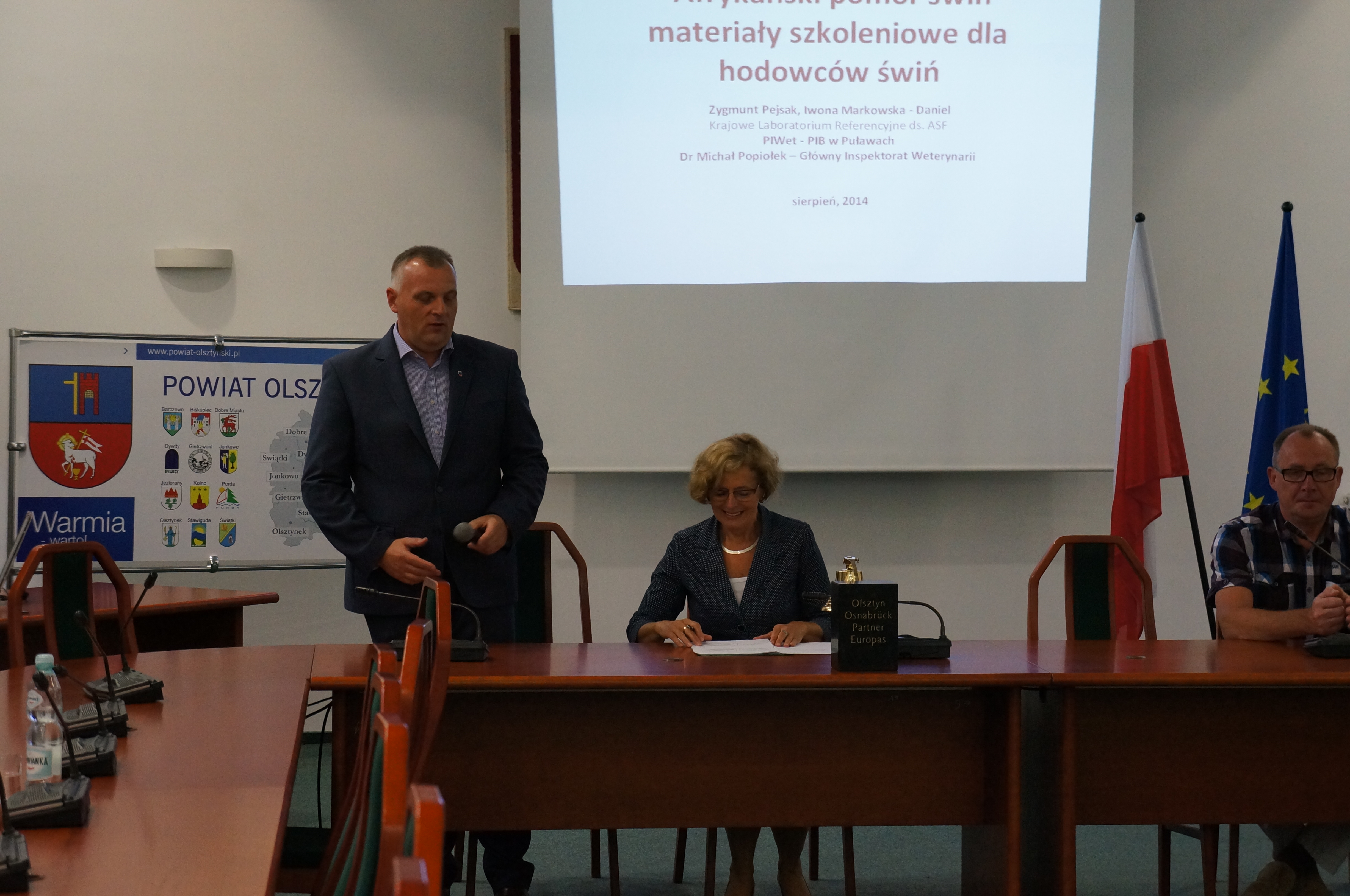 - Nie jesteśmy zagrożeni, a działamy wyłącznie profilaktycznie - tymi słowami starosta olsztyński Mirosław Pampuch rozpoczął spotkanie informacyjne dotyczące wirusa ASF, zwanego "afrykańskim pomorem świń". W sali sesyjnej Starostwa Powiatowego w Olsztynie Państwowy Powiatowy Inspektor Sanitarny spotkał się z przedstawicielami urzędów gmin Powiatu Olsztyńskiego i administratorami targowisk. Problem scharakteryzował lek. wet. Dariusz Malewski z Powiatowego Inspektoratu Weterynarii w Olsztynie.