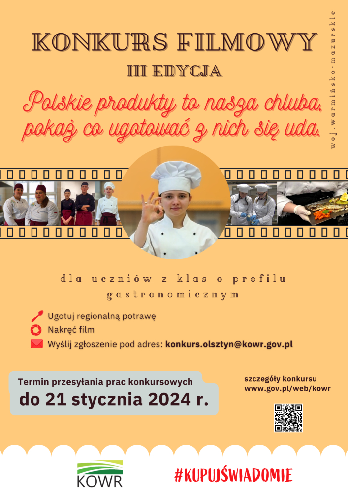 Krajowy Ośrodek Wsparcia Rolnictwa Oddział Terenowy w Olsztynie zaprasza uczniów kształcących się w klasach o profilu gastronomicznym w szkołach ponadpodstawowych z województwa warmińsko-mazurskiego do udziału w III edycji amatorskiego konkursu filmowego pn. "Polskie produkty to nasza chluba - pokaz, co ugotować z nich sie uda".