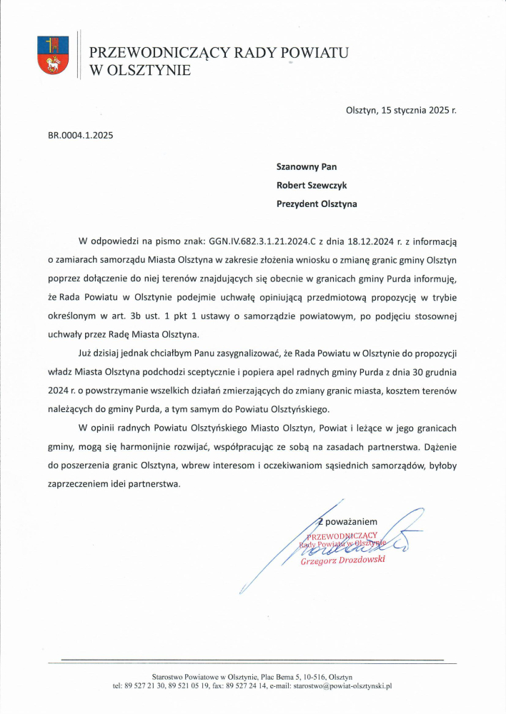 W swoim liście Grzegorz Drozdowski, przewodniczący Rady napisał do Roberta Szewczyka, prezydenta Olsztyna, m.in.: Chciałbym Panu zasygnalizować, że Rada Powiatu w Olsztynie do propozycji władz Miasta Olsztyna podchodzi sceptycznie i popiera apel radnych gminy Purda z dnia 30 grudnia 2024 r. o powstrzymanie wszelkich działań zmierzających do zmiany granic miasta, kosztem terenów należących do gminy Purda, a tym samym do Powiatu Olsztyńskiego.
