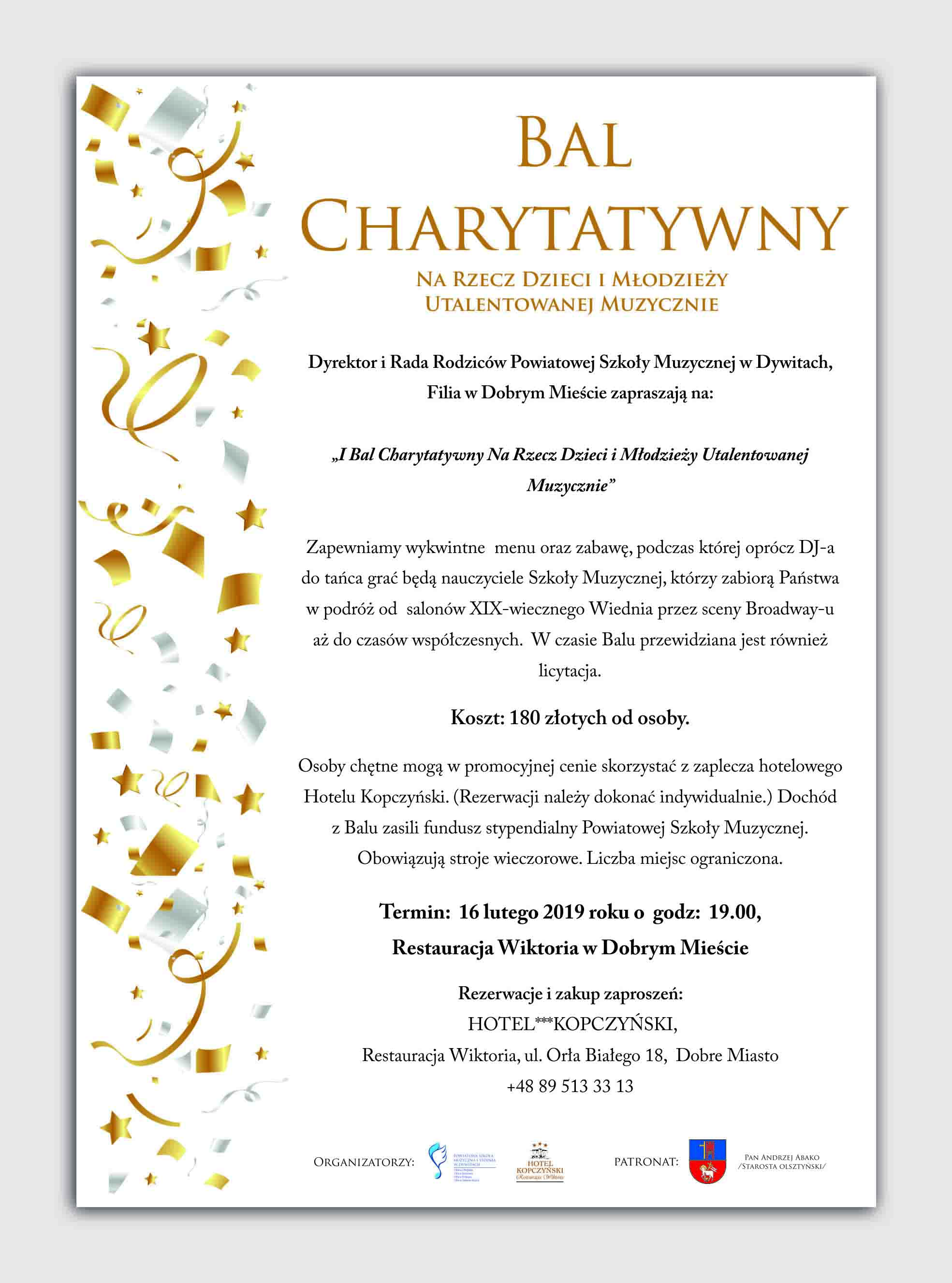 Lubisz zabawę na poziomie, w eleganckim towarzystwie, przy wykwintnym menu i doskonałej muzyce? Jeśli tak, nie może Cię zabraknąć na Balu Charytatywnym, który odbędzie się 16 lutego w Dobrym Mieście pod patronatem starosty. Dochód z balu zostanie przeznaczony na stypendia dla uczniów Powiatowej Szkoły Muzycznej w Dywitach. - Mimo iż nauka w szkole muzycznej jest bezpłatna, rodzice uzdolnionych uczniów ponoszą znaczne koszty związane choćby z wyjazdami na kursy i warsztaty mistrzowskie, podróże i zakwaterowanie. Szkoła znajduje sponsorów, ma możliwość pozyskiwania środków w ramach 1 %, ale szukamy dodatkowych sposobów na wsparcie naszych wychowanków - mówi Janusz Ciepliński, dyrektor PSM I st. w Dywitach.
