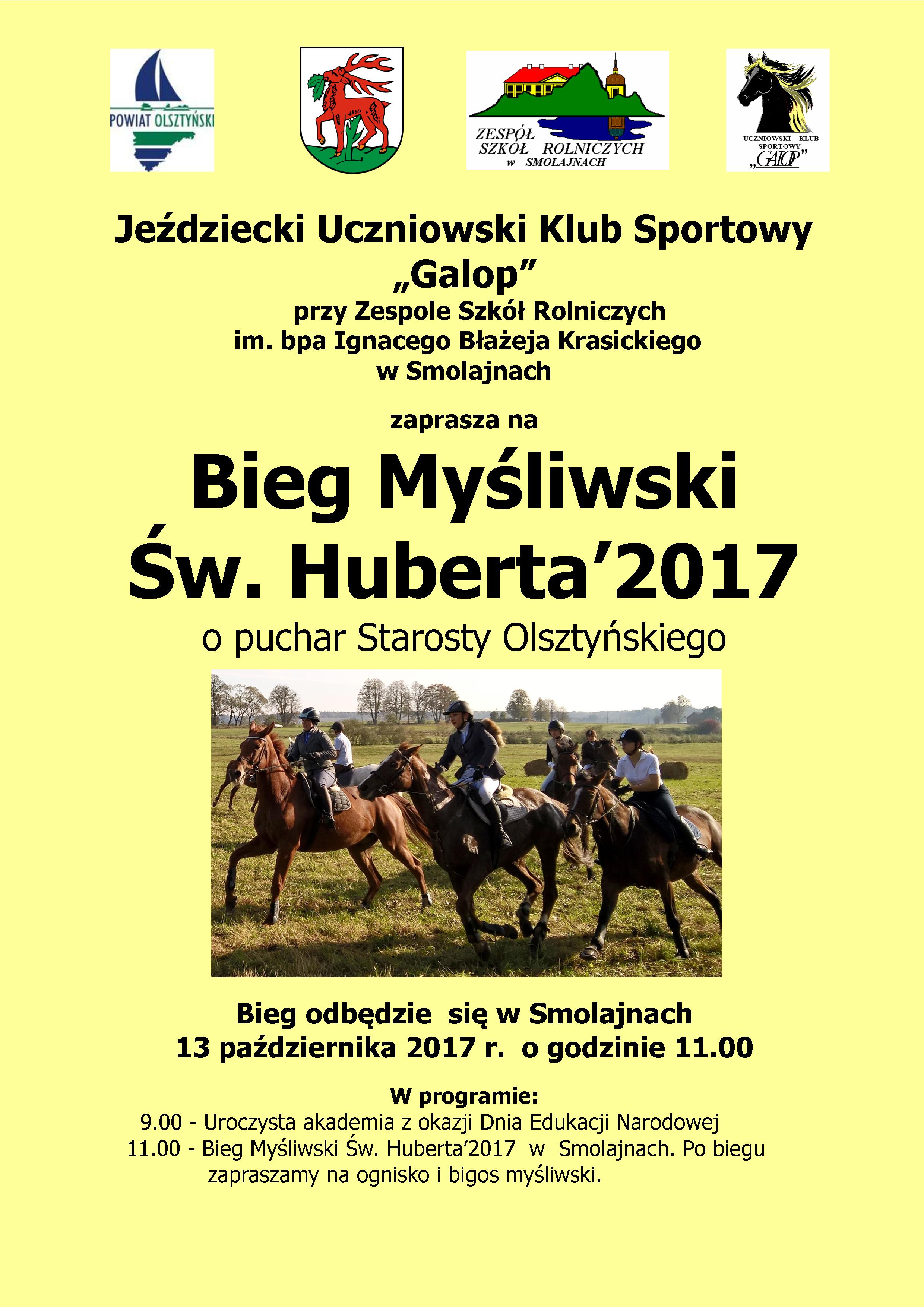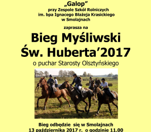 Jeździecki Uczniowski Klub Sportowy "Galop" przy Zespole Szkół Rolniczych w Smolajnach, zaprasza w piątek 13 października na Bieg Myśliwski Św. Huberta o Puchar Starosty Olsztyńskiego.