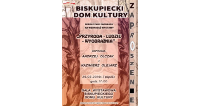 26 lutego 2016 roku w Biskupieckim Domu Kultury odbył się wernisaż wystawy "PRZYRODA-LUDZIE-WYOBRAźNIA" autorstwa Andrzeja Olczaka oraz Kazimierza Olejarza. Wystawa poświęcona ochronie środowiska przed zanieczyszczeniami. Wystawa ta, to również przekaz w którym ludzie przyrody jak i sama ona proszą o szacunek . Serdecznie zapraszam,...