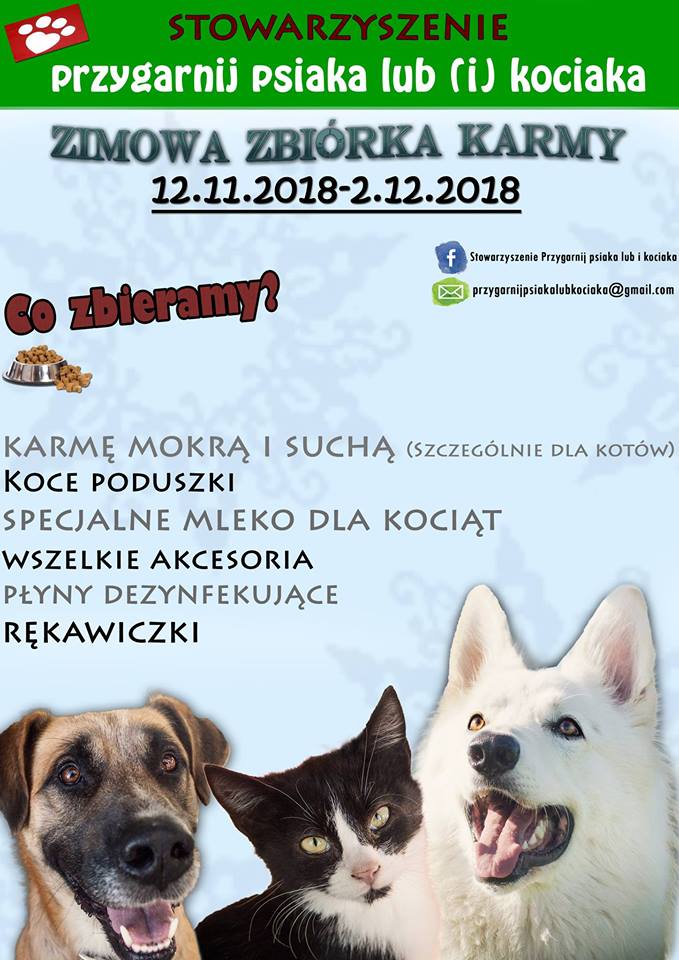 Tegoroczna zbiórka potrwa do 2 grudnia. Stowarzyszenie Przygarnij Psiaka lub (i) Kociaka potrzebuje: