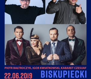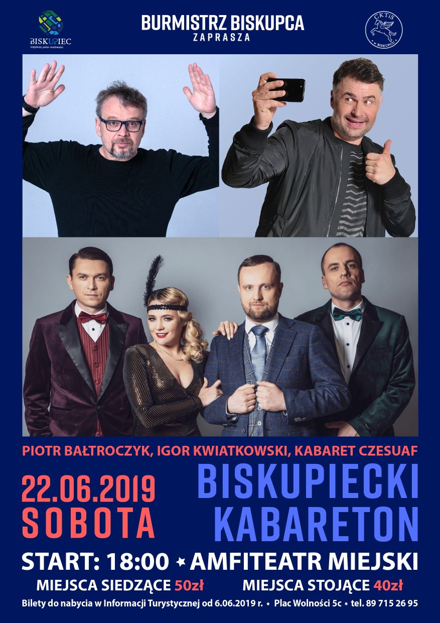 22 czerwca w amfiteatrze miejskim w Biskupcu odbędzie się trzecia edycja kabaretonu. Na scenie z solidną dawką humoru wystąpią gwiazdy. Piotr Bałtroczyk – znany już biskupieckiej publiczności kabareciarz i konferansjer, który swoistą sztukę słowa, pełną humoru i bardzo dobrego gustu opanował w sposób perfekcyjny. Igor Kwiatkowski – współzałożyciel kabaretu Paranienormalni, znany przede wszystkim z odgrywania oryginalnych postaci, takich jak Mariolka, Kryspin czy Jacek Balcerzak. Jego widowiska wyróżniają się błyskotliwym humorem, żartami z najwyższej półki, aktualnością i niemal namacalnym kontaktem z publicznością. Kabaret Czesuaf – który jak piszą sami o sobie – tworzą trzej fajni faceci i jedna fajna babka. Czesuaf umiejętnie łączy humor społeczno-obyczajowy ze sporą dawką absurdu, który zawsze potrafi zaskakiwać publiczność świeżymi pomysłami.