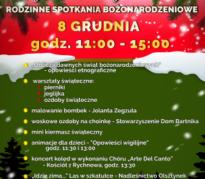 W programie ponadto ilustracja słowno-muzyczna dla dzieci Hanny Banasiak – „W starej szafie…” oraz mini kiermasz świąteczny. Na gości czekać będą jeszcze inne atrakcje: warsztaty malowania bombek z Jolantą Zegzułą oraz warsztaty wykonywania woskowych zawieszek na choinkę – Stowarzyszenie Dom Bartnika, a także stoisko Pijalni Ziół Jakuba Babickiego. O godz. 13:30, w Kościele z Rychnowa odbędzie się koncert kolęd w wykonaniu Chóru Arte Del Canto z Olsztynka. Nadleśnictwo Olsztynek z kolei zaprezentuje wystawę mobilną „Idzie zima-Las w szkatułce”.