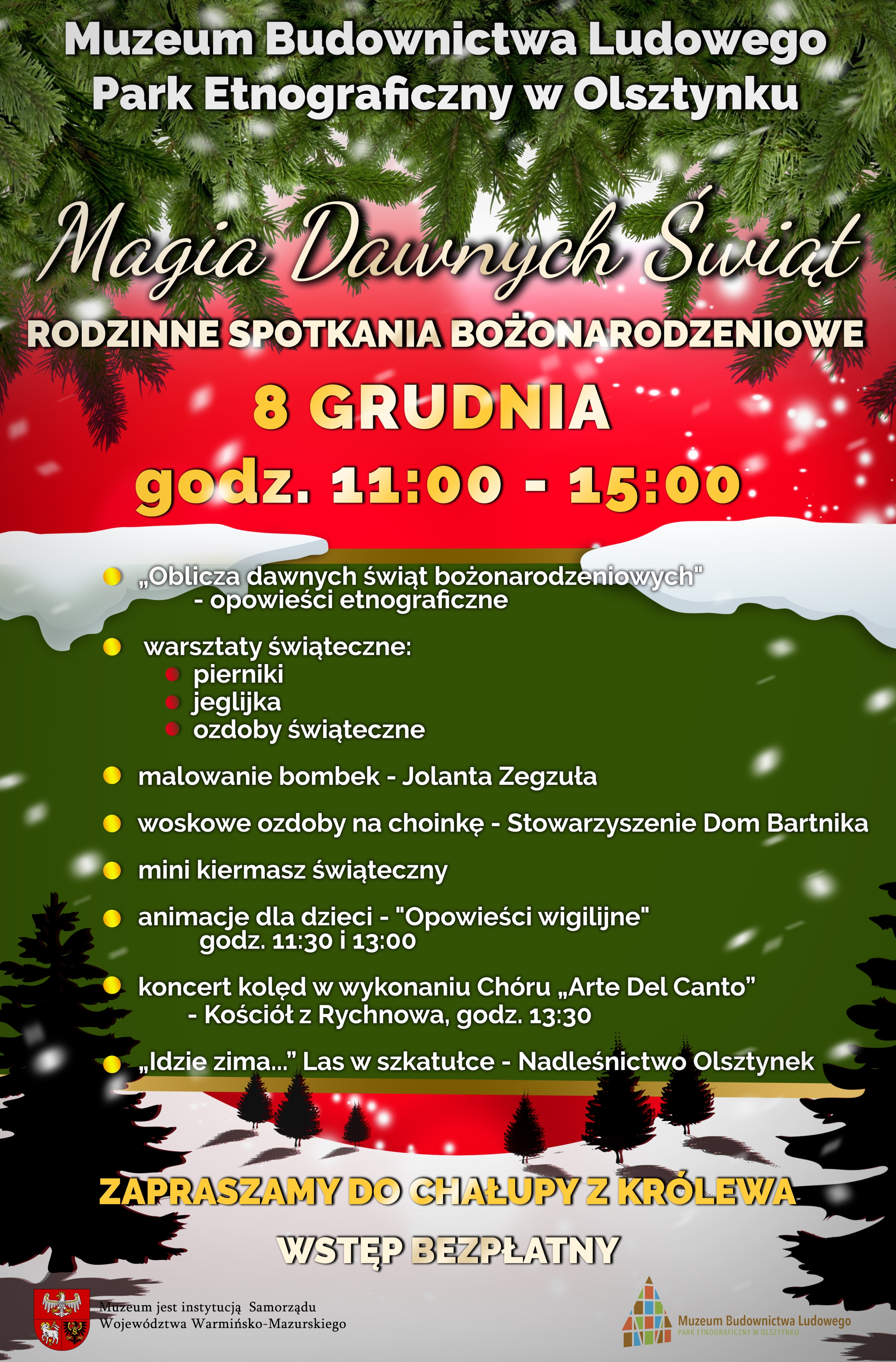 Muzeum Budownictwa Ludowego – Park Etnograficzny w Olsztynku zaprasza w niedzielę 8 grudnia w godz. 11:00-15:00 na przedświąteczne spotkanie „Magia dawnych świąt – Rodzinne spotkania bożonarodzeniowe w skansenie”. W zabytkowej chałupie, przy dźwiękach kolęd i zapachu choinki snute będą etnograficzne opowieści, jak to dawnymi czasy na mazurskiej i warmińskiej wsi w święta bywało. Uczestniczy zobaczą jak wykonać i ustroić własną „jeglijkę” i udekorować pierniki.