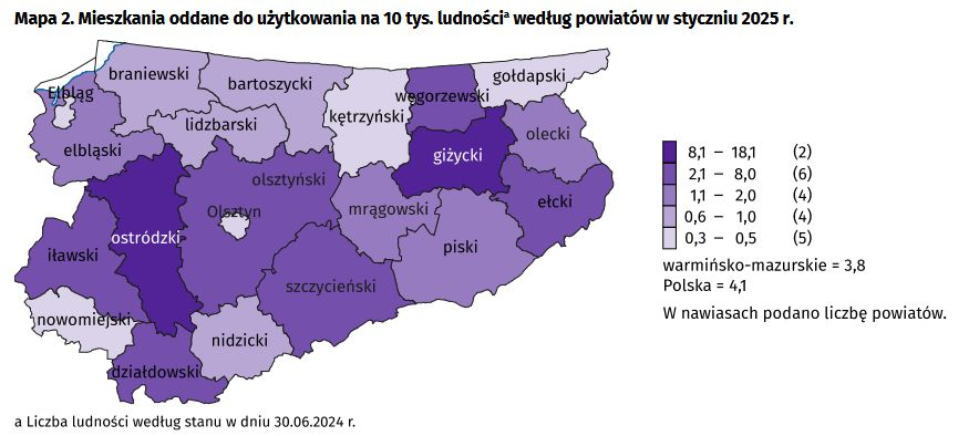 Jak informuje Urząd Statystyczny w Olsztynie w styczniu 2025 r., w porównaniu z analogicznym miesiącem ub.r. wzrosła liczba mieszkań rozpoczętych (o 77,3%) oraz mieszkań oddanych do użytkowania (o 41,3%). Spadła natomiast liczba mieszkań, na budowę których uzyskano pozwolenia lub dokonano zgłoszeń z projektem budowlanym (o 42,1%).