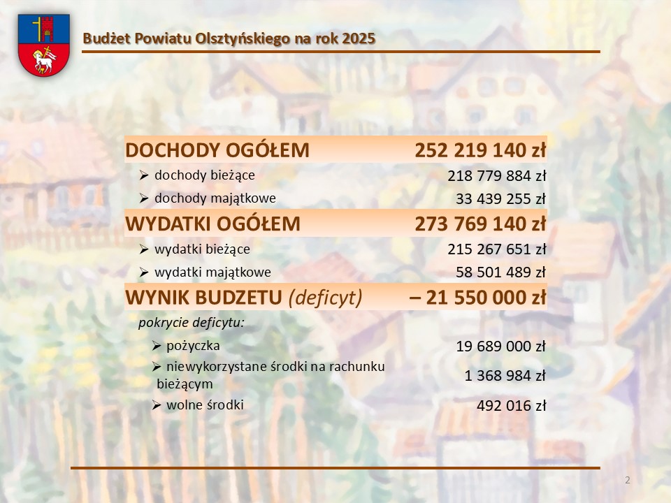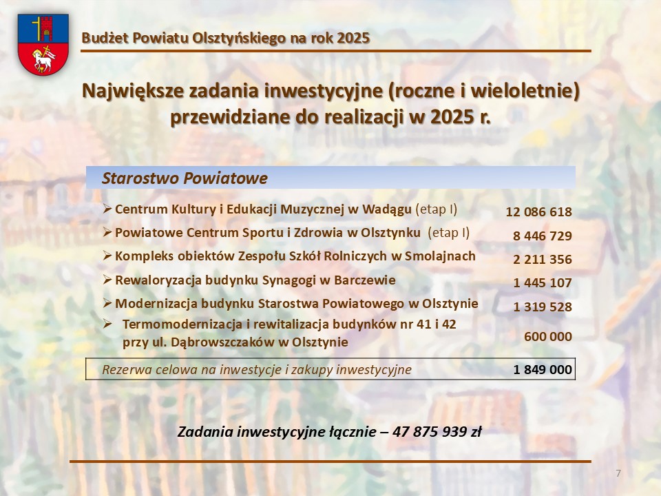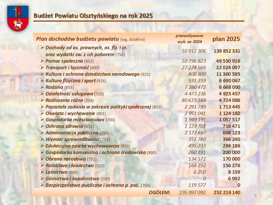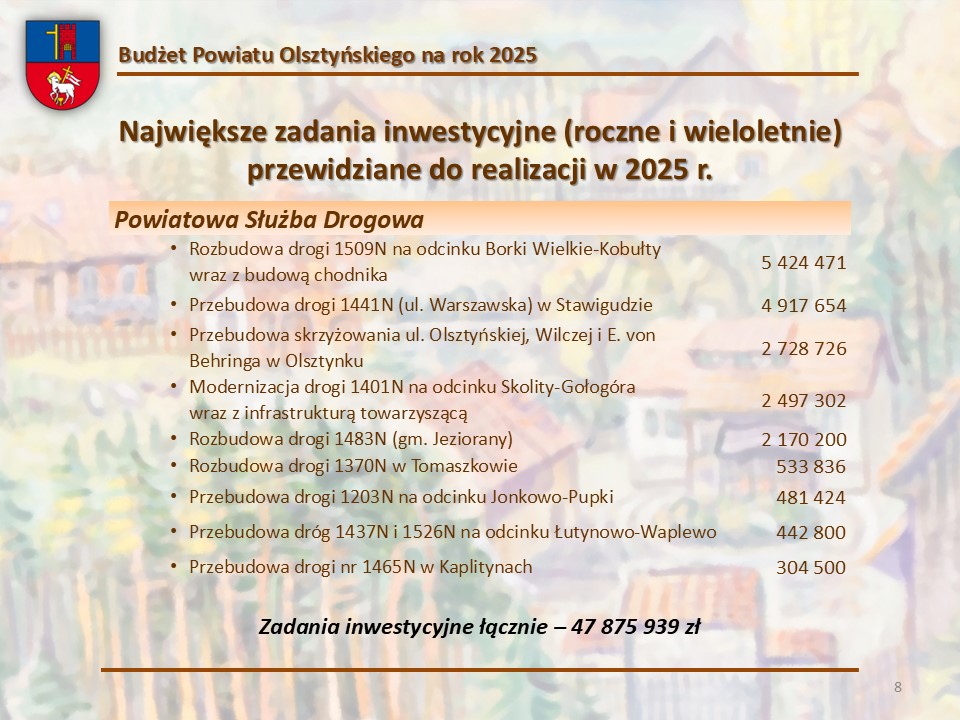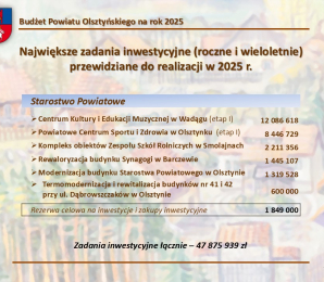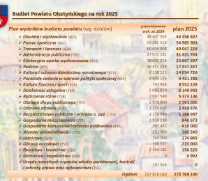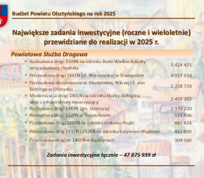 - Inwestycyjny, ambitny, wymagający dużego nakładu sił i środków do realizacji. To budżet rekordowy, z którego 70% środków na inwestycje chcemy przeznaczyć na drogi - tak mówi o budżecie Powiatu Olsztyńskiego na 2025 rok Andrzej Abako, starosta olsztyński. Rada Powiatu w Olsztynie 20 grudnia 2024 przegłosowała uchwały o budżecie samorządu na przyszły rok oraz Wieloletnią Prognozę Finansową na lata 2025-2024.