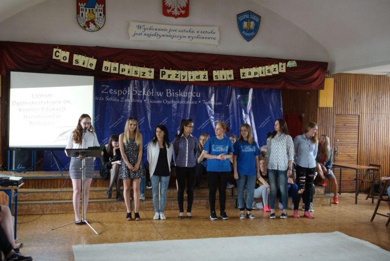Obok takiego wezwania, nikt nie może przejść obojętnie. To pomysł Samorządu Uczniowskiego Zespołu Szkół w Biskupcu na dotarcie do gimnazjalistów w czasie Dnia Otwartego, który odbył się 3 czerwca. Nie zabrakło też, oczywiście, bardziej oficjalnych haseł oraz zajęć przygotowanych specjalnie na tę okazję. W wydarzeniu wzięło udział około 140 zaproszonych uczniów z pięciu szkół.Dzień Otwarty organizowany przez nauczycieli i uczniów Zespołu Szkół w Biskupcu to wieloletnia tradycja, której ideą jest przybliżenie w atrakcyjny sposób warunków i atmosfery szkoły potencjalnym nowym uczniom oraz zachęcenie ich do dołączenia do społeczności uczniowskiej od kolejnego roku szkolnego.