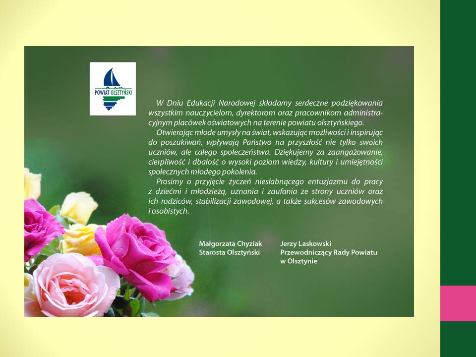 Z okazji Dnia Edukacji Narodowej składamy serdeczne podziękowania wszystkim nauczycielom, dyrektorom oraz pracownikom administracyjnym placówek oświatowych na terenie powiatu olsztyńskiego.