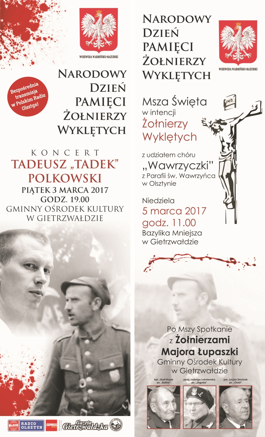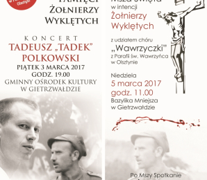 Również w piątek 3 marca w Gminnym Ośrodku Kultury w Gietrzwałdzie (ul. Kościelna 1) odbędzie się koncert poświęcony Żołnierzom Wyklętym. O godz. 19:00 rozpocznie się koncert Tadeusza "TADKA" Polkowskiego, rapera znanego m.in. z wieloletnich występów w zespole hip-hopowym Firma, którego był współzałożycielem. Od 2011 r. muzyk realizuje karierę solową, wiele utworów poświęca Żołnierzom Wyklętym. Wstęp na koncert jest wolny. Wcześniej, o godz. 18.00, na antenie Radia Olsztyn można będzie wysłuchać rozmowy z artystą. Koncert w Gietrzwałdzie będzie transmitowany na żywo.