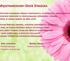 Z okazji Międzynarodowego Dnia Strażaka wszystkim funkcjonariuszom Państwowej Straży Pożarnej, Ochotniczej Straży Pożarnej, a także członkom Młodzieżowych Drużyn Pożarniczych serdecznie dziękujemy za poświęcenie, trud i odwagę podczas ratowania życia, zdrowia i mienia mieszkańców powiatu olsztyńskiego. Wiemy, że zawsze możemy liczyć na Państwa pomoc.
