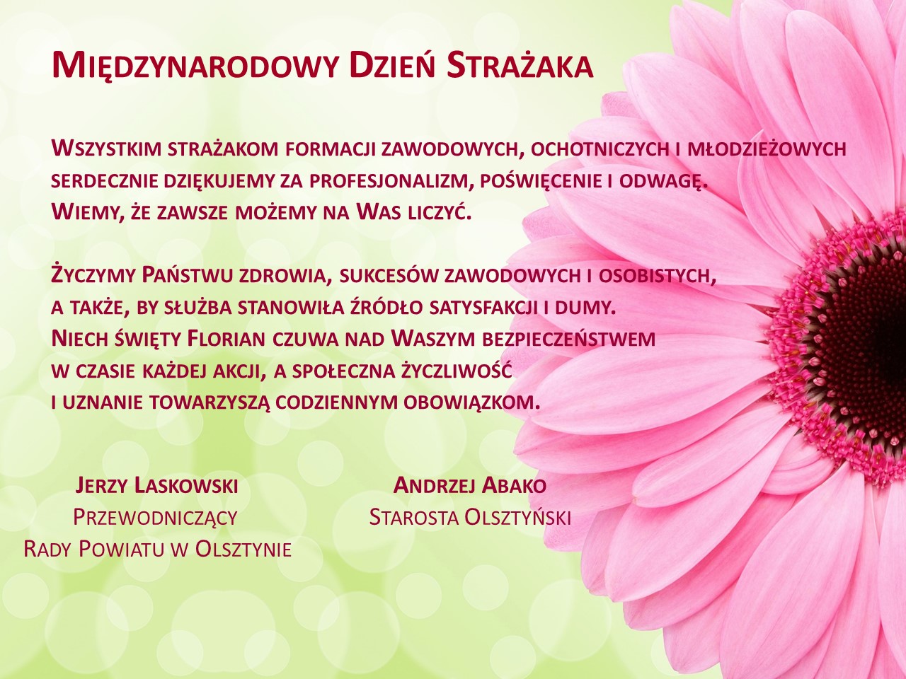 Prosimy o przyjęcie życzeń dobrego zdrowia, wszelkiej pomyślności, sukcesów zawodowych i osobistych. Niech strażacki patron - święty Florian, czuwa nad Państwa bezpieczeństwem w czasie każdej akcji, a społeczna życzliwość i uznanie towarzyszą codziennej pracy.