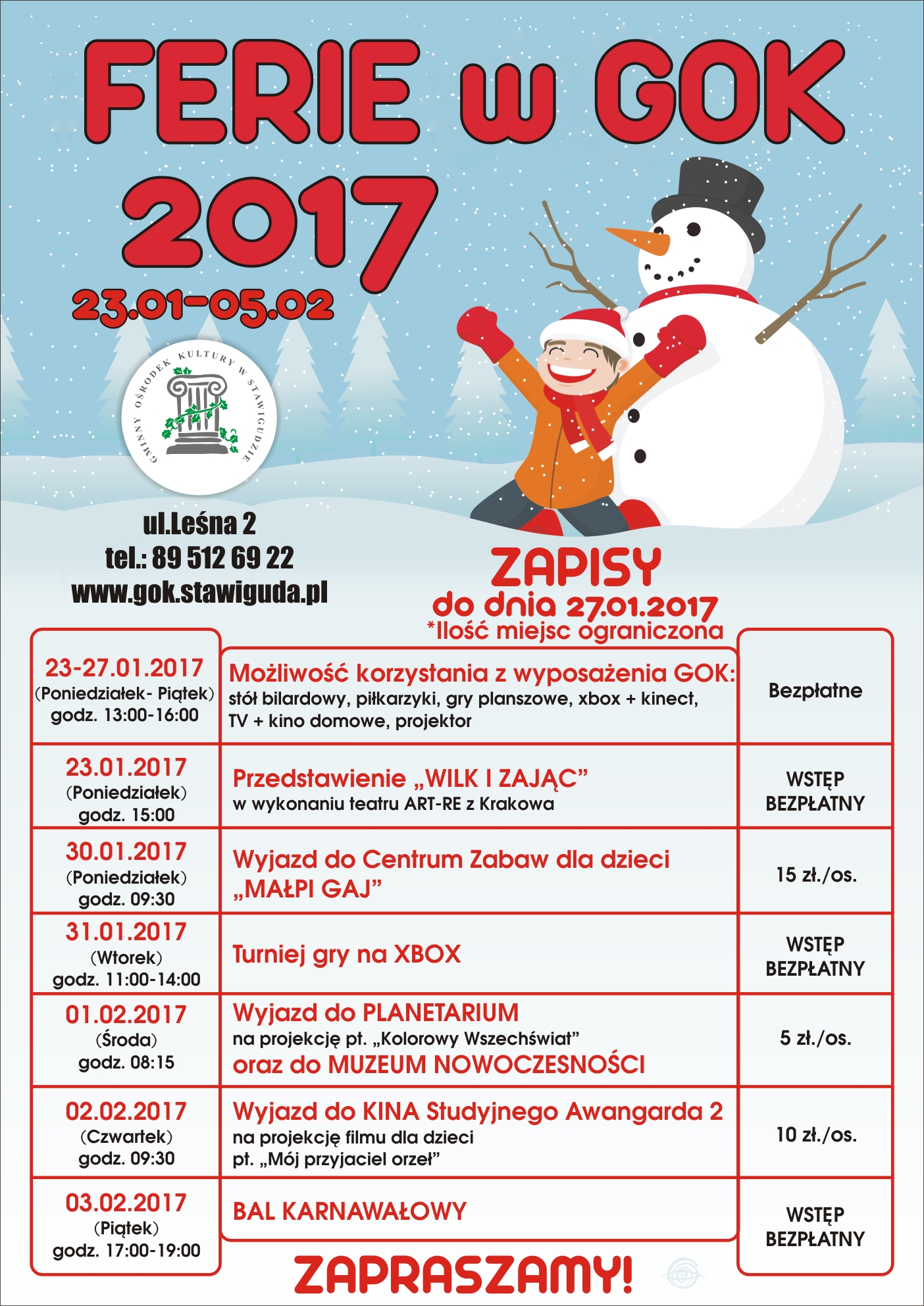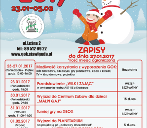 Gminny Ośrodek Kultury w Stawigudzie zaprasza dzieci na ferie zimowe. Szczegóły na plakacie poniżej.