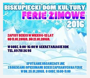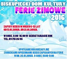 Ferie w Biskupieckim Domu Kultury mają już wieloletnią tradycję. W tym roku odbyły się po raz 16. Tylko, a może aż 65 dzieci mogło ciekawie, na zorganizowanych zajęciach spędzić wolne dni. Czas upływał uczestnikom ferii dynamicznie, bez ekranu komputera, iPod’a, czy telefonu komórkowego. I jak dzieciaki oceniły – nie był to czas stracony, a wręcz przeciwnie.