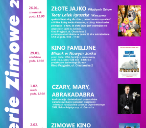 26 stycznia godz. 11:00 - Kino Przyjaźń, ul. Olsztyńska 2Złote jajko - Władymir Orłow - Teatr Lalek Igraszka – WarszawaSpektakl teatralny o chytrej Lisicy, która ma pomysł na szybkie wzbogacenie się. Swój plan przedstawia koledze w złodziejskim fachu - Wilkowi. Muszą razem ukraść babci i dziadkowi złote jajko. Z tego jajka wykluje się złota kurka. Złota kurka zniesie mnóstwo złotych jajek. Złote jajka zapewnią Wilkowi i Lisicy wielkie bogactwo. Niestety, zamiast kury wykluwa się kogucik - trzeba go wychować... Oj, Lisica bardzo się zdenerwuje! Co z tego wyniknie? Spektakl to pełna humoru opowieść o Wilku, który kocha Kurczaka, o Lisicy, która kocha pieniądze i o tym, że złote serce jest ważniejsze od wszystkich złotych jajek na świecie.