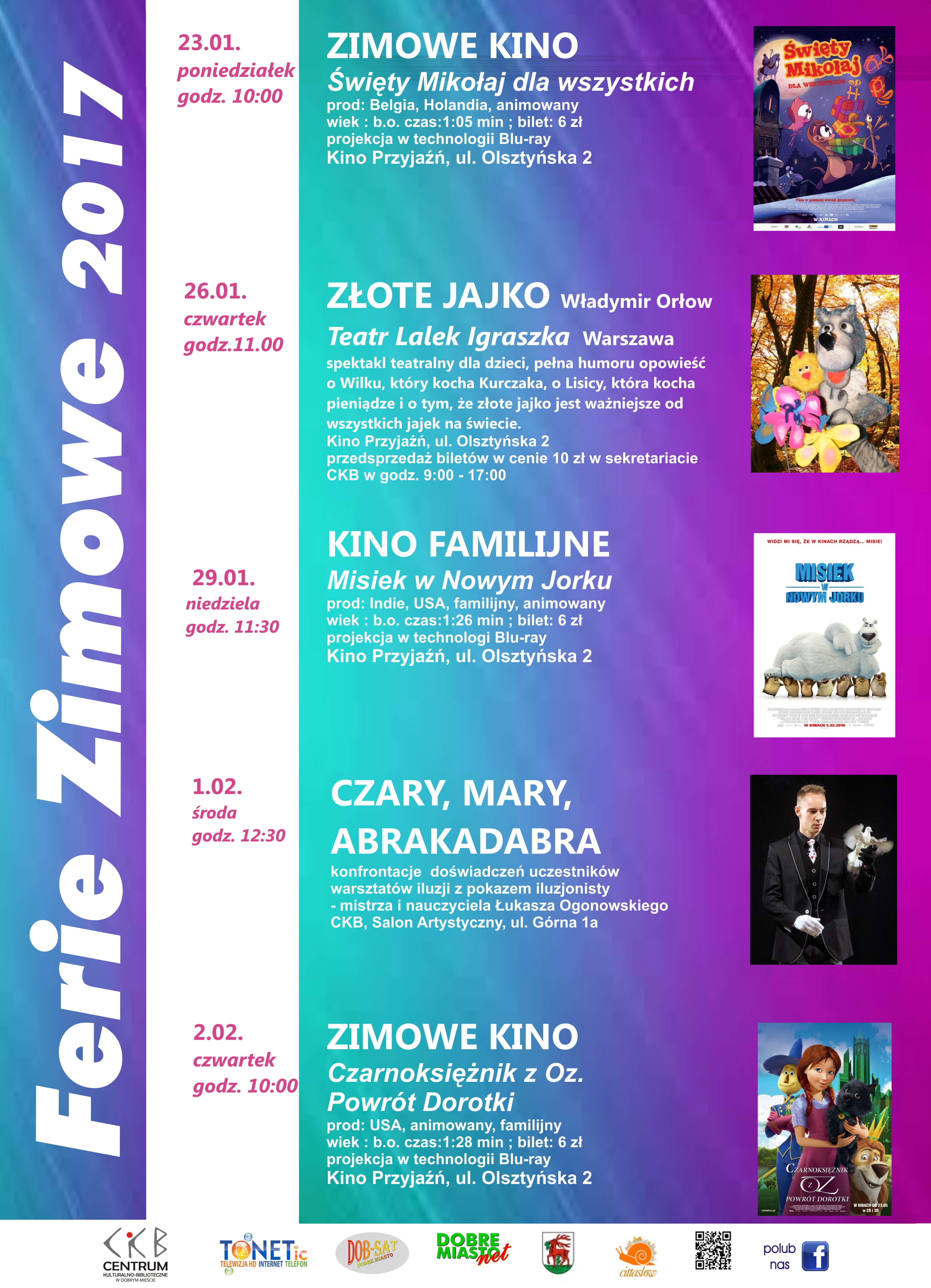 23 stycznia, godz. 10:0 0Kino Przyjaźń, ul. Olsztyńska 2 Zimowe Kino - Święty Mikołaj dla wszystkichprod. Belgia, Holandia, animowany; Wiek: b.o.; czas: 1:05 min.; bilet: 6 zł projekcja w technologii Blu-ray