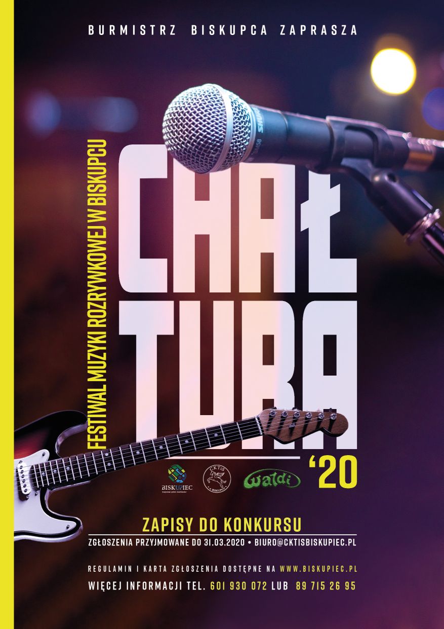 Trwa nabór wykonawców na Festiwal Muzyki Rozrywkowej w Biskupcu „Chałtura 2020”.Celem tego wydarzenia jest popularyzacja muzyki rozrywkowej i promocja utalentowanych wokalnie i muzycznie zespołów, które grają i śpiewają stare i nowe przeboje „na żywo”, czyli nie korzystają z playbacku i półplaybacku.