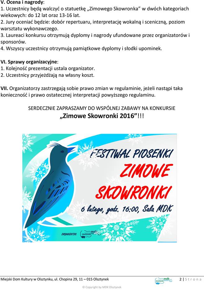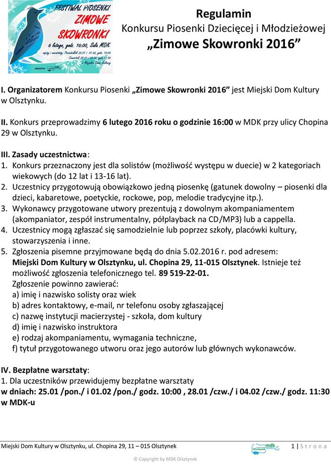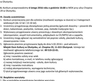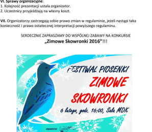 Miejski Dom Kultury w Olsztynku zaprasza w sobotę 6 lutego 2016 roku o godzinie 16:00 na Festiwal Piosenki "Zimowe Skowronki 2016". Konkurs kierowany jest do młodzieży w kategoriach wiekowych do 12 lat i 13-16. Sala MDK Olsztynek, ul. Chopina 29. Regulamin na zdjęciach poniżej.