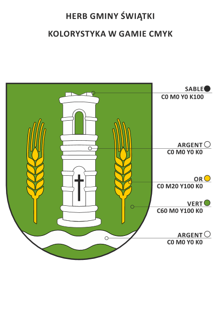 Rada Gminy Świątki, z inicjatywy wójta Sławomira Kowalczyka, podjęła uchwałę w sprawie uchwalenia herbu i pochodnych herbu Gminy Świątki.Herbem Gminy Świątki jest wizerunek kapliczki w tarczy w polu zielonym. Tarcza jest jednopolna o kształcie typu hiszpańskiego. Na tarczy umieszczone jest godło w kolorze białym (srebrnym). Godłem herbu jest wizerunek kapliczki kolumnowej znajdującej się w Dąbrówce. Po prawej i po lewej stronie znajduje się żółty (złoty) kłos pszenicy symbolizujący rolny charakter gminy. Podstawą herbu jest srebrny wizerunek rzeki – Pasłęki. Pochodnymi herbu Gminy Świątki jest flaga z godłem Gminy Świątki oraz pieczęcie herbowe.