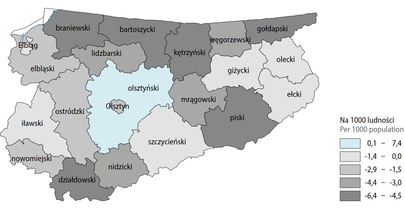 W 2023 r. w wyniku ruchów migracyjnych w 20 powiatach województwa warmińsko-mazurskiego saldo migracji wewnętrznych i zagranicznych przyjęło wartości ujemne. Najniższy współczynnik migracji na 1000 ludności, a tym samym największe wyludnienie spowodowane migracjami, odnotowano w powiatach braniewskim, kętrzyńskim i gołdapskim. Dodatnie saldo wystąpiło tylko w powiecie olsztyńskim.