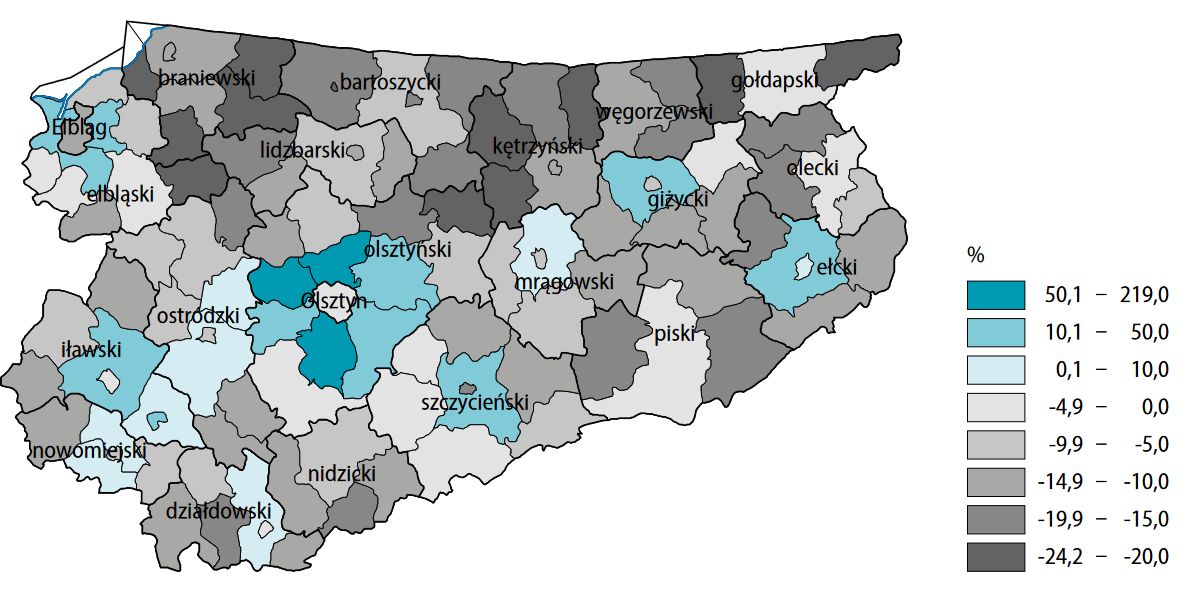 W 95 gminach regionu liczba ludności zmniejszyła się. Gminy o charakterze depopulacyjnym zlokalizowane były głównie w północnej części województwa. Spadek liczby mieszkańców dotyczył również wszystkich gmin powiatu lidzbarskiego, nidzickiego, oleckiego i piskiego, a także miast na prawach powiatu – Olsztyna i Elbląga. Ubytek ludności wyższy niż 10% odnotowano w 60 gminach.