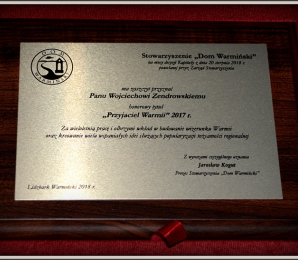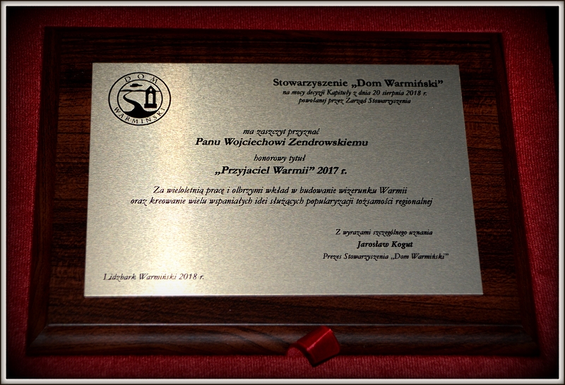 Dnia 9 listopada na Zamku Biskupów Warmińskich w Lidzbarku Warmińskim odbyła się konferencja ”Warmińskie drogi do niepodległości”, podczas której nagrodzeni honorowym tytułem „Przyjaciela Warmii” otrzymali statuetki Copernicusa. W tym roku z Gminy Barczewo taką statuetkę otrzymał Wojciech Zenderowski. Statuetka corocznie wręczana jest dla osób, które doskonale znają historię własnego regionu, swojej „małej ojczyzny”. Pan Wojciech Zenderowski jest autorem wielu publikacji o Gminie Barczewo m.in. „Miasto z aniołami w herbie. Historia Barczewa” oraz „Gmina Barczewo. Śladami historii”. Gratulujemy za otrzymane wyróżnienie.