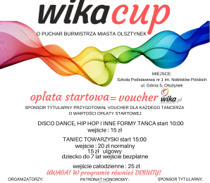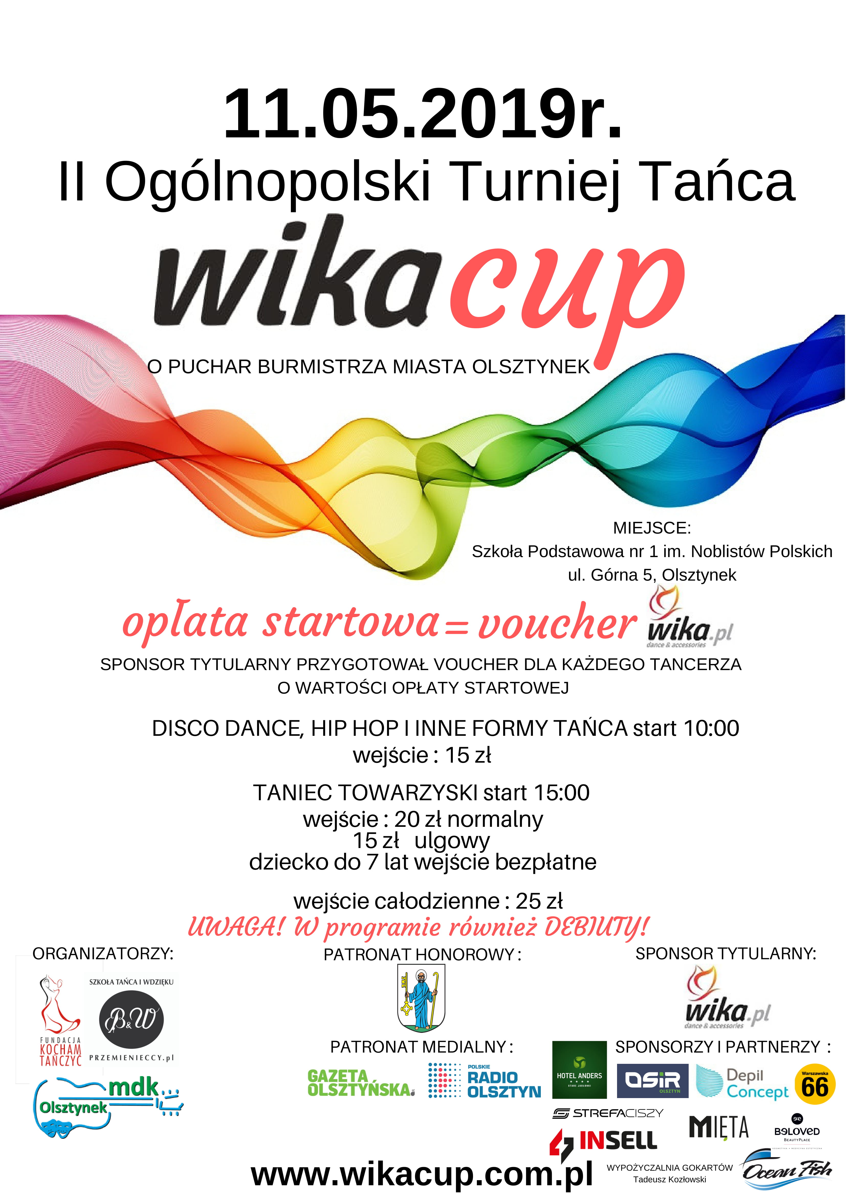 11 maja br. w hali sportowej przy Szkole Podstawowej nr 1 im. Noblistów Polskich w Olsztynku odbędzie się II Ogólnopolski Turniej Tańca Wika Cup o Puchar Burmistrza miasta Olsztynek.