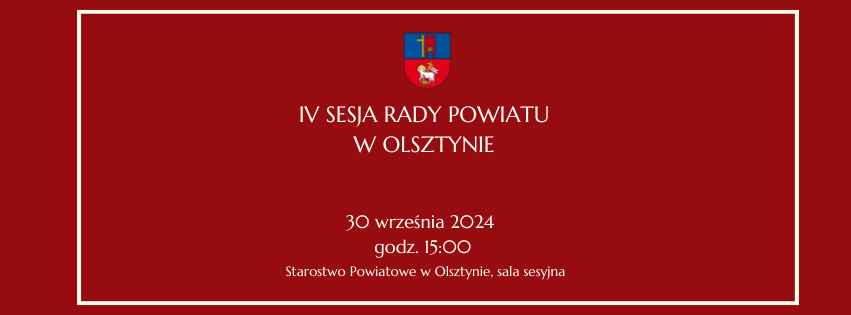 Informujemy, że 30 września 2024 roku o godz. 1500 w sali sesyjnej nr 1 w siedzibie Powiatu Olsztyńskiego, Plac Bema 5 w Olsztynie, odbędzie się IV Sesja Rady Powiatu w Olsztynie zwołana w trybie art. 15 ust. 7 ustawy z dnia 5 czerwca 1998 r. o samorządzie powiatowym (Dz. U. z 2024 r., poz. 107).