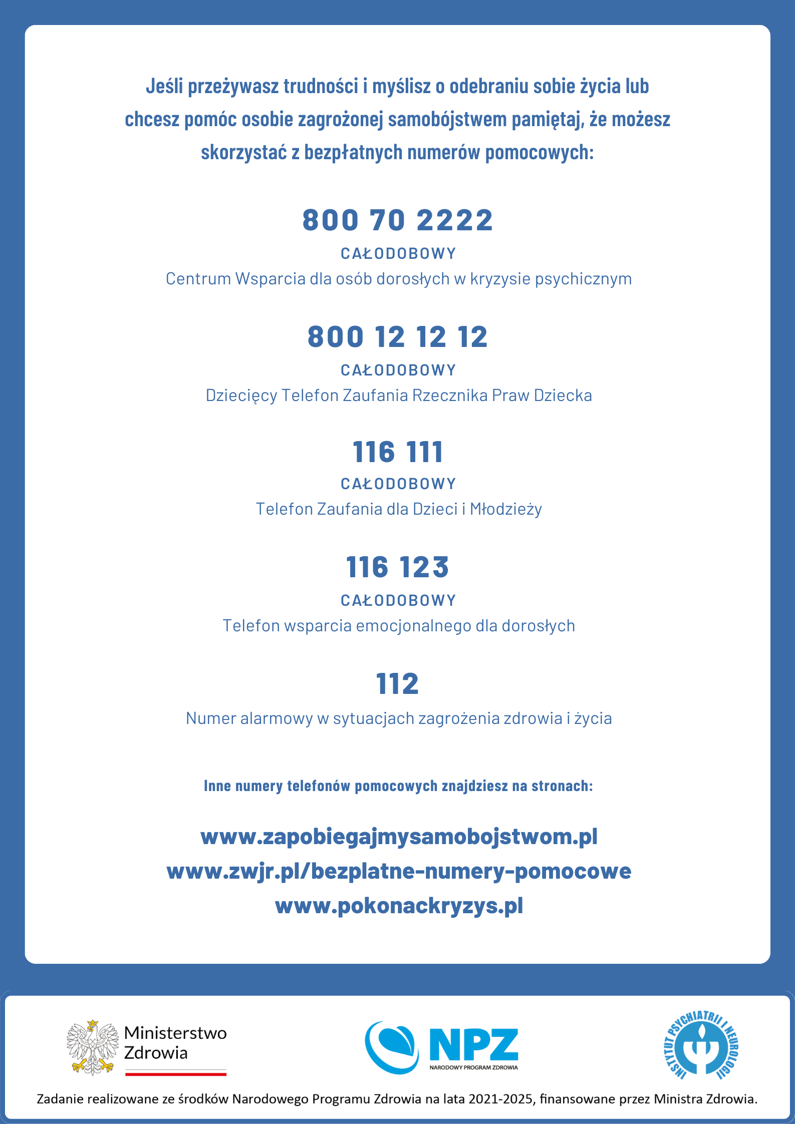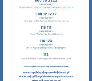 W Polsce codziennie 225 osób próbuje odebrać sobie życie, a 15 osób je sobie odbiera. Każde samobójstwo i każda próba wpływa na 20 osób z najbliższego otoczenia, dlatego tak ważne jest, aby zwracać uwagę na osoby z naszego otoczenia, które mogą znajdować się w kryzysie psychicznym. Nie bójmy się korzystać z pomocy psychologa czy psychiatry. Dbajmy o swoje zdrowie psychiczne tak samo, jak o fizyczne. To bardzo ważne!