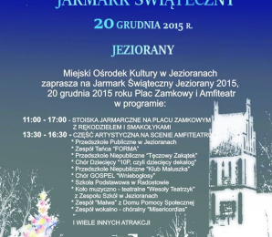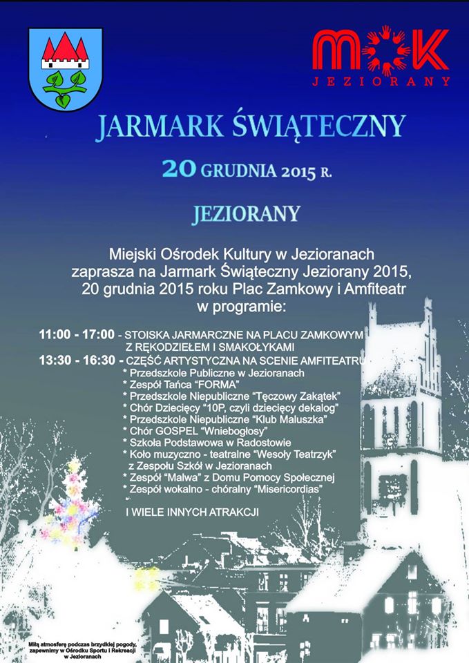 Miejski Ośrodek Kultury w Jezioranach i Gmina Jeziorany zapraszają w niedzielę 20 grudnia 2015 roku na Jarmark Świąteczny. Impreza odbędzie się w Amfiteatrze Miejskim w Jezioranach. Start godzina 11:00.