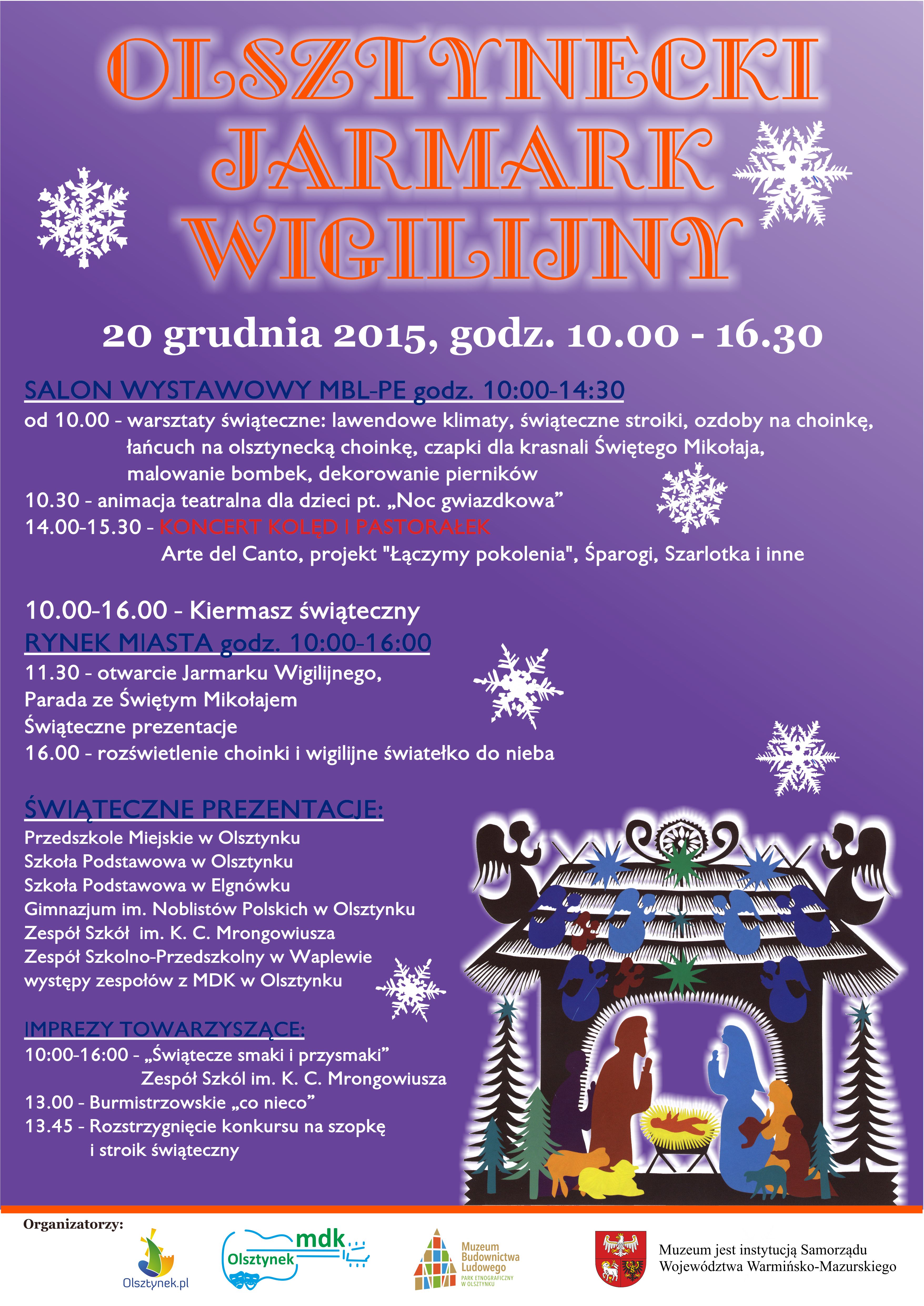 Miejski Dom Kultury w Olsztynku zadbał o część artystyczną. Nie zabraknie świątecznych prezentacji w wykonaniu przedszkolaków i wspólnego śpiewania kolęd z uczniami olsztyneckich szkół. O godz. 14 rozpocznie się koncert kolęd i pastorałek. Wystąpią m.in. olsztynecki chór kameralny Arte Del Canto, kapela ludowa Śparogi oraz zespoły działające przy domu kultury. Rozstrzygnięty zostanie też konkurs na świąteczną szopkę oraz stroik.