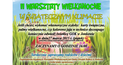 Gminny Ośrodek Kultury w Jonkowie zaprasza na II Warsztaty Wielkanocne "W świątecznym klimacie". W piątek 27 marca 2015 od godz. 16:00 do 19:30 w stołówce szkoły podstawowej i gimnazjum instruktorzy GOK będą pokazywać, jak własnoręcznie wykonać karty wielkanocne, palmy, kolorowe jajka w technice decoupage. Szczególnie mile...