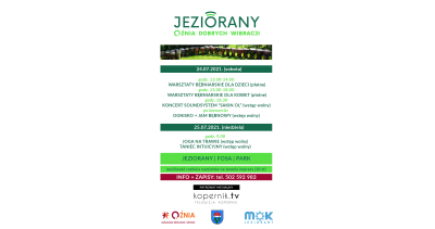 Miejski Ośrodek Kultury w Jezioranach zaprasza w dniach 24-25 lipca 2021 na imprezę pn. "Qźnia Dobrych Wibracji". Oj, będzie się działo: bębniło, tańczyło, grało! Szczegółowe informacje na plakacie: