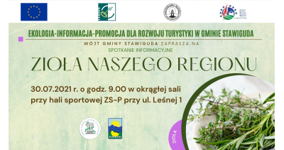 Gmina Stawiguda zaprasza na spotkanie informacyjne "Zioła naszego regionu", realizowane w ramach projektu "Ekologia - Informacja - Promocja dla rozwoju Turystyki w Gminie Stawiguda", które odbędzie się w dniu 30.07.2021 r. o godz. 9.00 w okrągłej sali przy hali sportowej ZS-P przy ul. Leśnej 1. O wydarzeniu: prowadząca na początku...