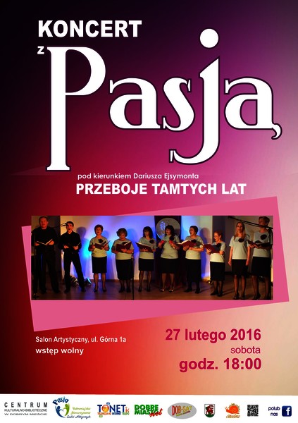 Centrum Kulturalno-Biblioteczne w Dobrym Mieście zaprasza w sobotę 27 lutego 2016 roku na koncert znanych przebojów muzyki rozrywkowej zespołu Pasja. Start godz. 18:00 CKB, ul. Górna 1a.
