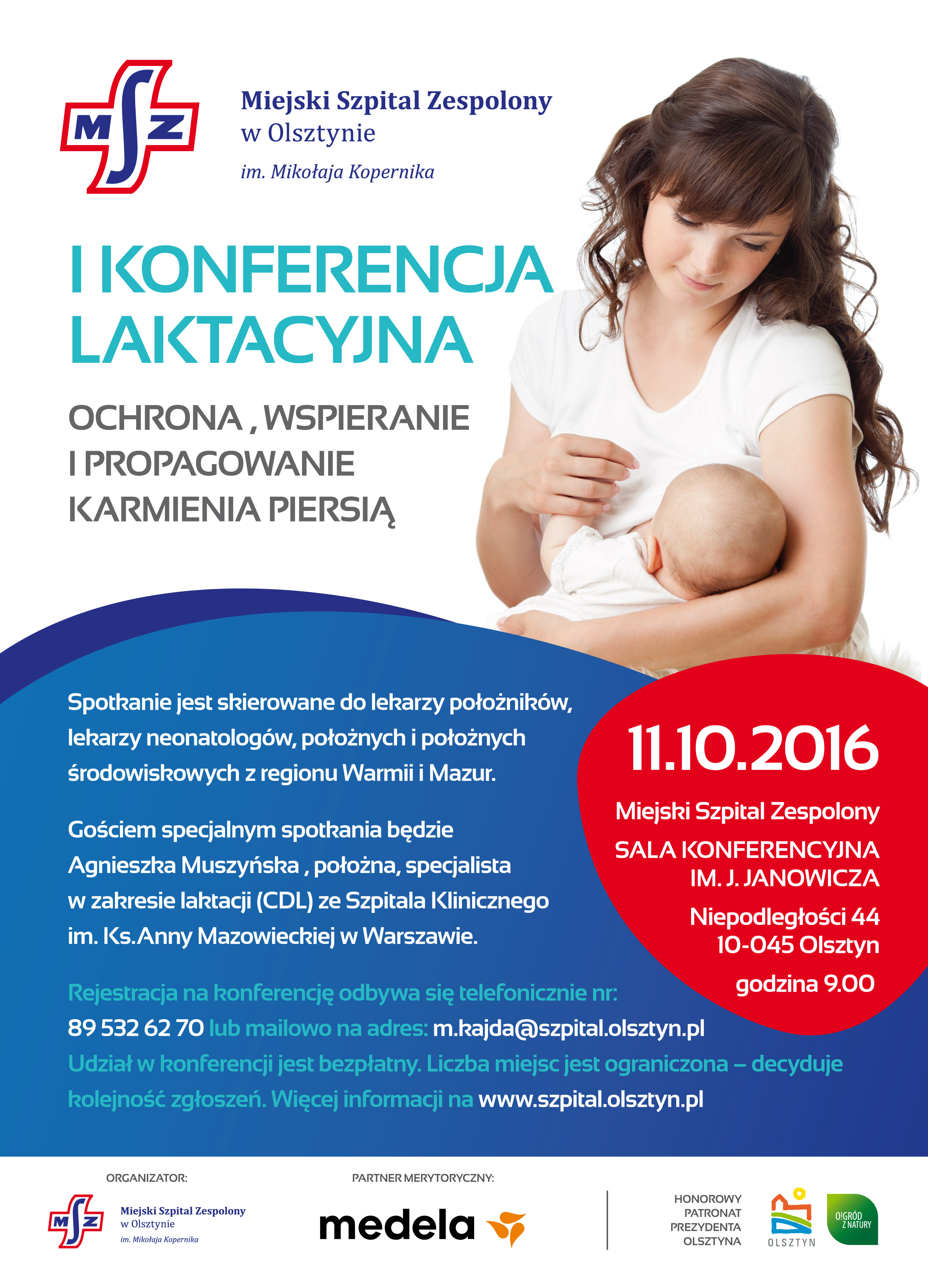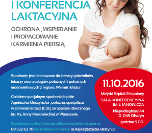 W poniedziałek 11 października o godz. 9:00 w sali konferencyjnej im. J. Janowicza w Olsztynie (ul. Niepodległości 44, 10-045 Olsztyn ) odbędzie się "I Konferencja Laktacyjna" w ramach programu „Zdrowy Powiat Olsztyński”. Serdecznie zapraszamy do udziału w konferencji lekarzy położników, lekarzy neonatologów, położnych i położnych środowiskowych i wszystkie osoby zainteresowane problematyką ochrony, wspierania i propagowania karmienia piersią.