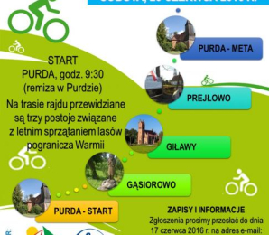 Start w Purdzie o godz. 9:30 (remiza przy Purdzie). Na trasie rajdu przewidziane są trzy postoje związane z letnim sprzątaniem lasów pogranicza Warmii.