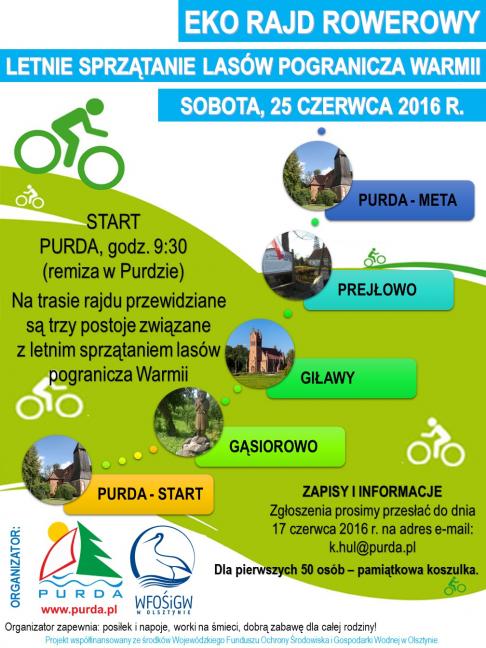 Gmina Purda zaprasza na Eko Rajd Rowerowy - Letnie sprzątanie lasów pogranicza Warmii, który odbędzie się w sobotę 25 czerwca.