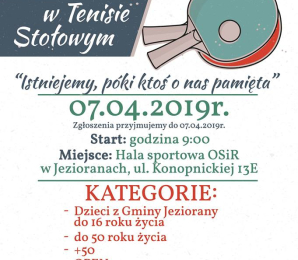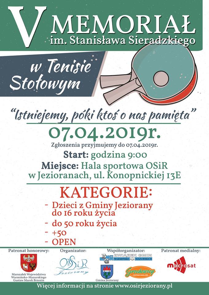 Gmina Jeziorany zaprasza w niedzielę 7 kwietnia na V Memoriał im. Stanisława Sieradzkiego w tenisie stołowym.
