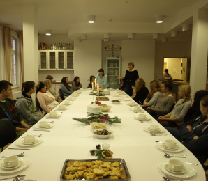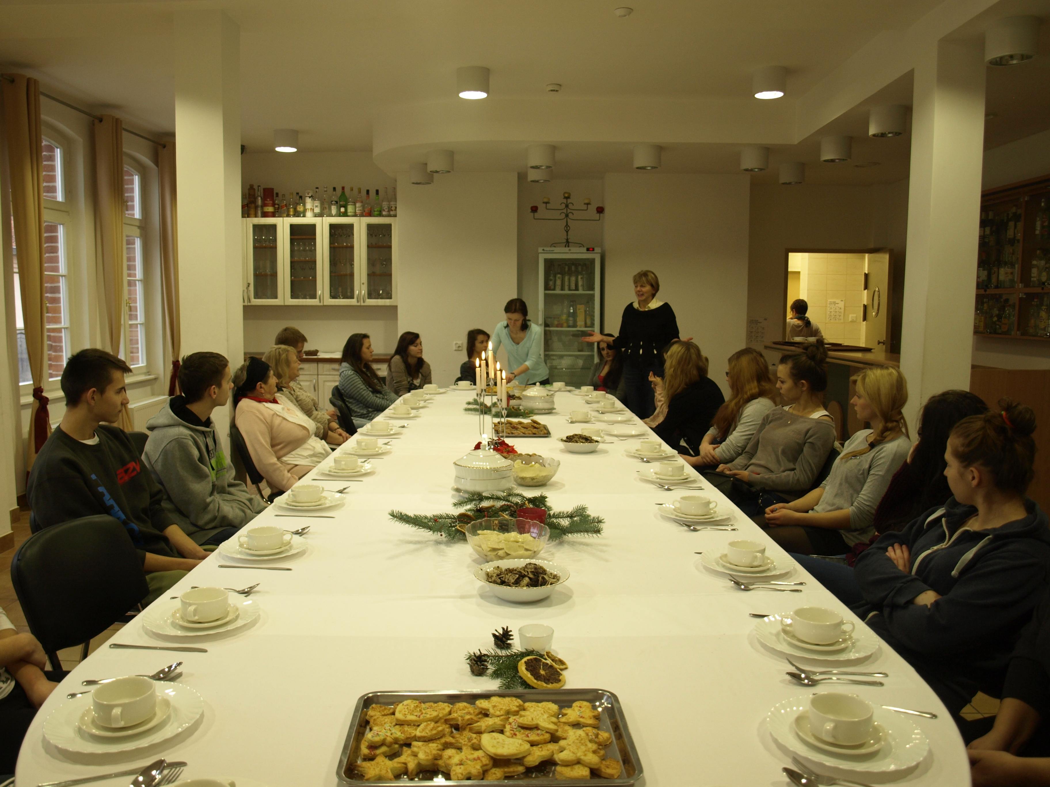 Wspólnemu gotowaniu towarzyszyły opowieści o zwyczajach bożonarodzeniowych ziemi warmińskiej, mazurskiej, kurpiowskiej i wileńskiej. Po przygotowaniu potraw wszyscy zasiedli przy pięknie udekorowanym stole do degustacji. Były pierniki, ciasteczka, kulebiaki, łazanki z makiem, czerwony barszczyk na naturalnym zakwasie, pierogi z kapustą i grzybami, a także z grochem. Bożena Serafin, szefowa Koła Gospodyń opowiadała o działalności pań, a Celina Koper przybliżyła młodzieży zwyczaje związane z dekorowaniem choinek i wigilijnym stołem w gronie najbliższych. Wśród gości była też seniorka Czesława Prusik, która jest członkinią Koła od 42 lat!