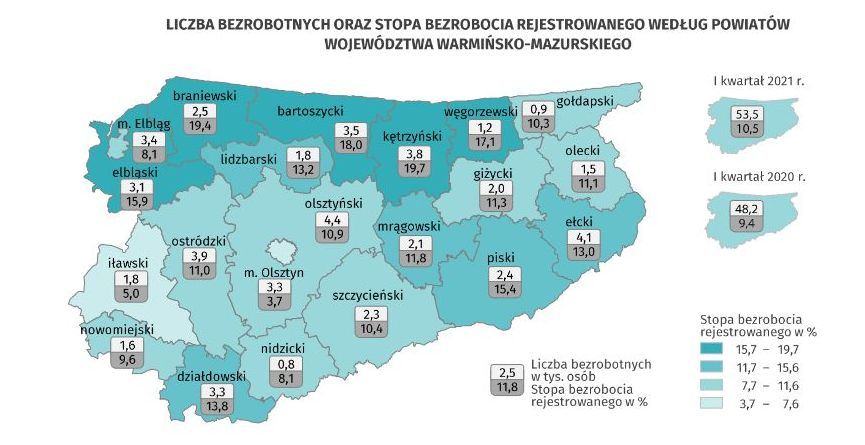 Są już też dane o stanie bezrobocia w regionie przygotowane przez Urząd Statystyczny w Olsztynie. Wynika z nich, że w województwie warmińsko-mazurskim w I kwartale 2021 roku liczba bezrobotnych wyniosła 53,5 tys. osób, a stopa bezrobocia rejestrowanego to 10,5 proc. (w analogicznym czasie w 2020 roku – liczba bezrobotnych to 48,2 tys. osób, a stopa bezrobocia - 9,4 proc.).