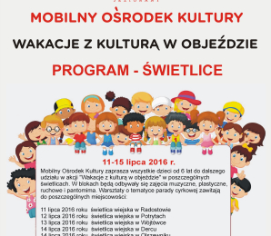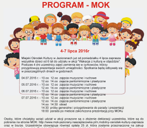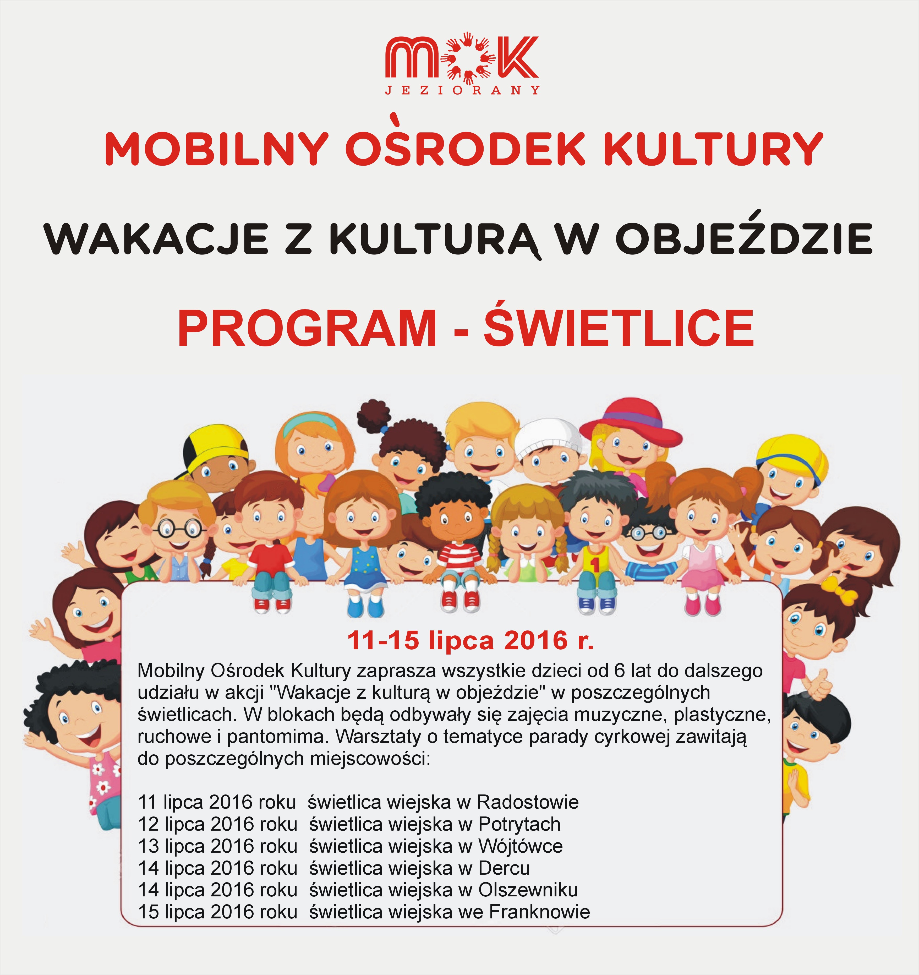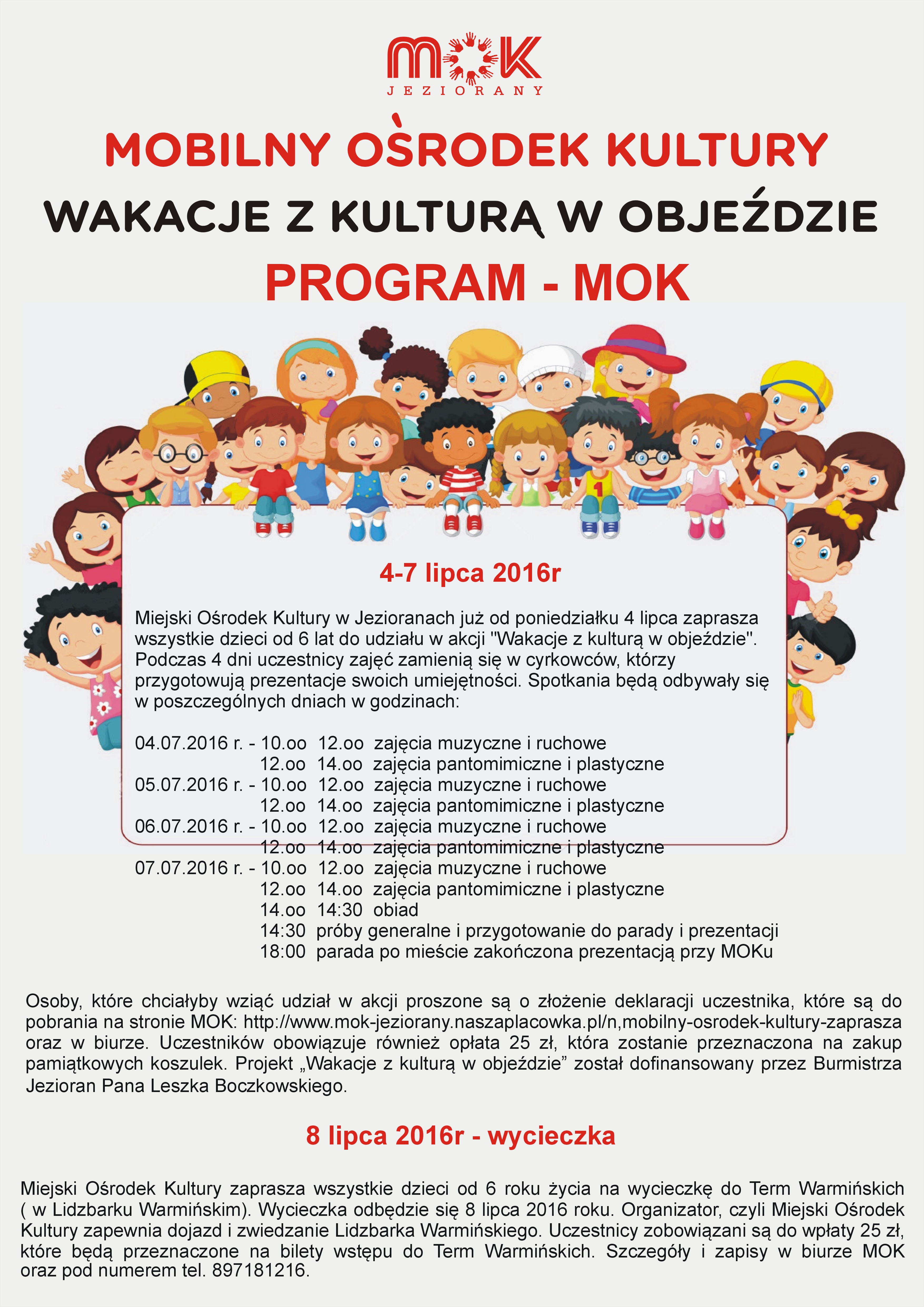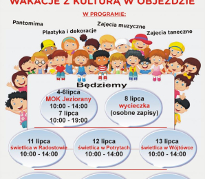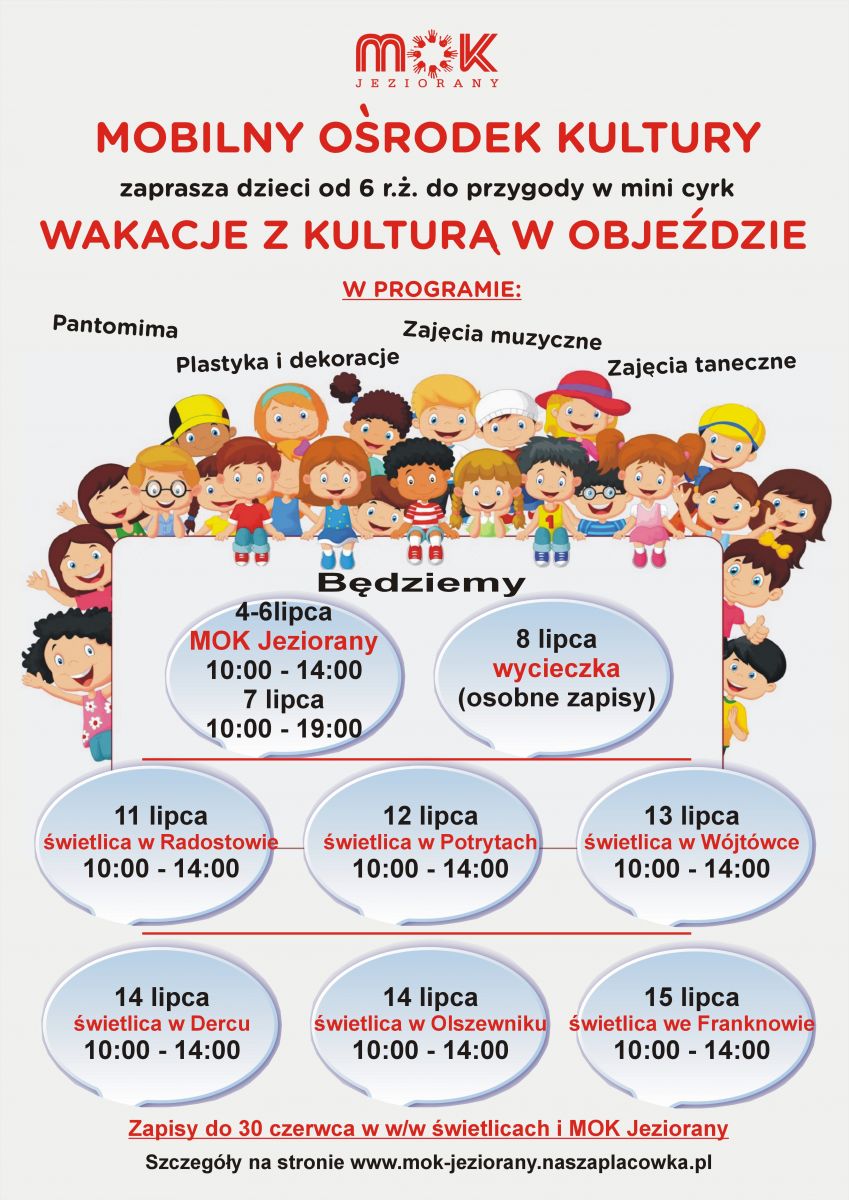Miejski Ośrodek Kultury w Jezioranach od poniedziałku 4 lipca wyjeżdża w teren, aby w ramach akcji "Wakacje z kulturą w objeździe" dotrzeć do jak największej ilości dzieci z terenu gminy Jeziorany. MOK z pomocą animatorów chce stworzyć z uczestnikami mini cyrk. Jest to nowa forma jaką wprowadza w tym roku. Akcję dofinansował burmistrz Jezioran Leszek Boczkowski, mając na uwadze dobro dzieci, które nie mogą wyjechać poza miejsce zamieszkania w okresie wakacji. Karty dla uczestników do pobrania na stronie MOK-u -