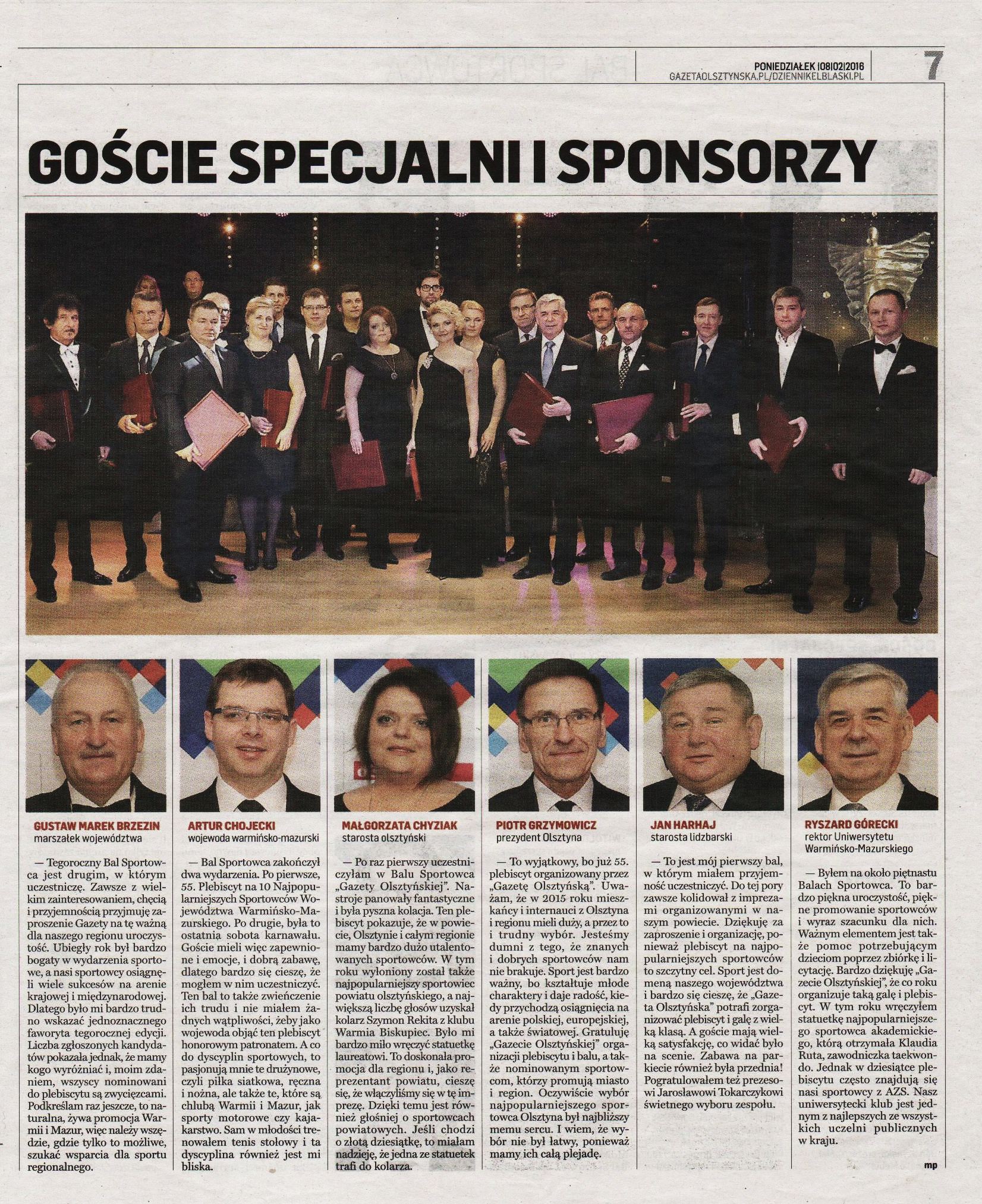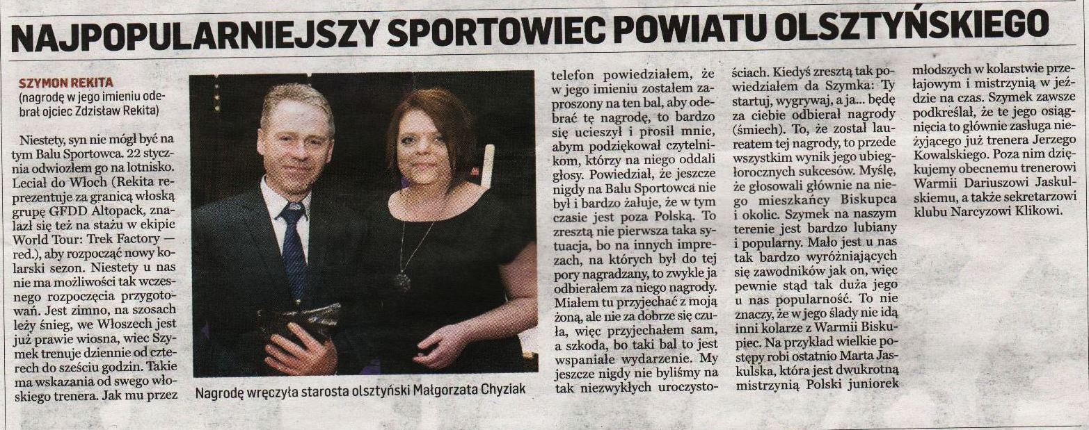 55. Plebiscyt na 10 Najpopularniejszych Sportowców Województwa Warmińsko-Mazurskiego organizowany przez Gazetę Olsztyńską przeszedł do historii. Decyzją czytelników i internautów najpopularniejszym zawodnikiem Warmii i Mazur został Marcin Malewski, szczypiornista Warmii Traveland Olsztyn. W kategorii Najpopularniejszy Sportowiec Powiatu Olsztyńskiego najwięcej głosów zostało oddanych na Szymona Rekitę, kolarza z Warmii Biskupiec. 6 lutego podczas Balu Sportowca starosta olsztyński Małgorzata Chyziak przekazała nagrodę na ręce ojca zawodnika.