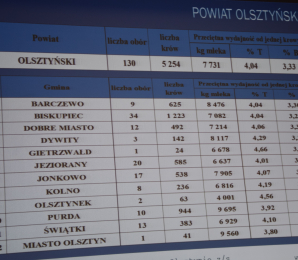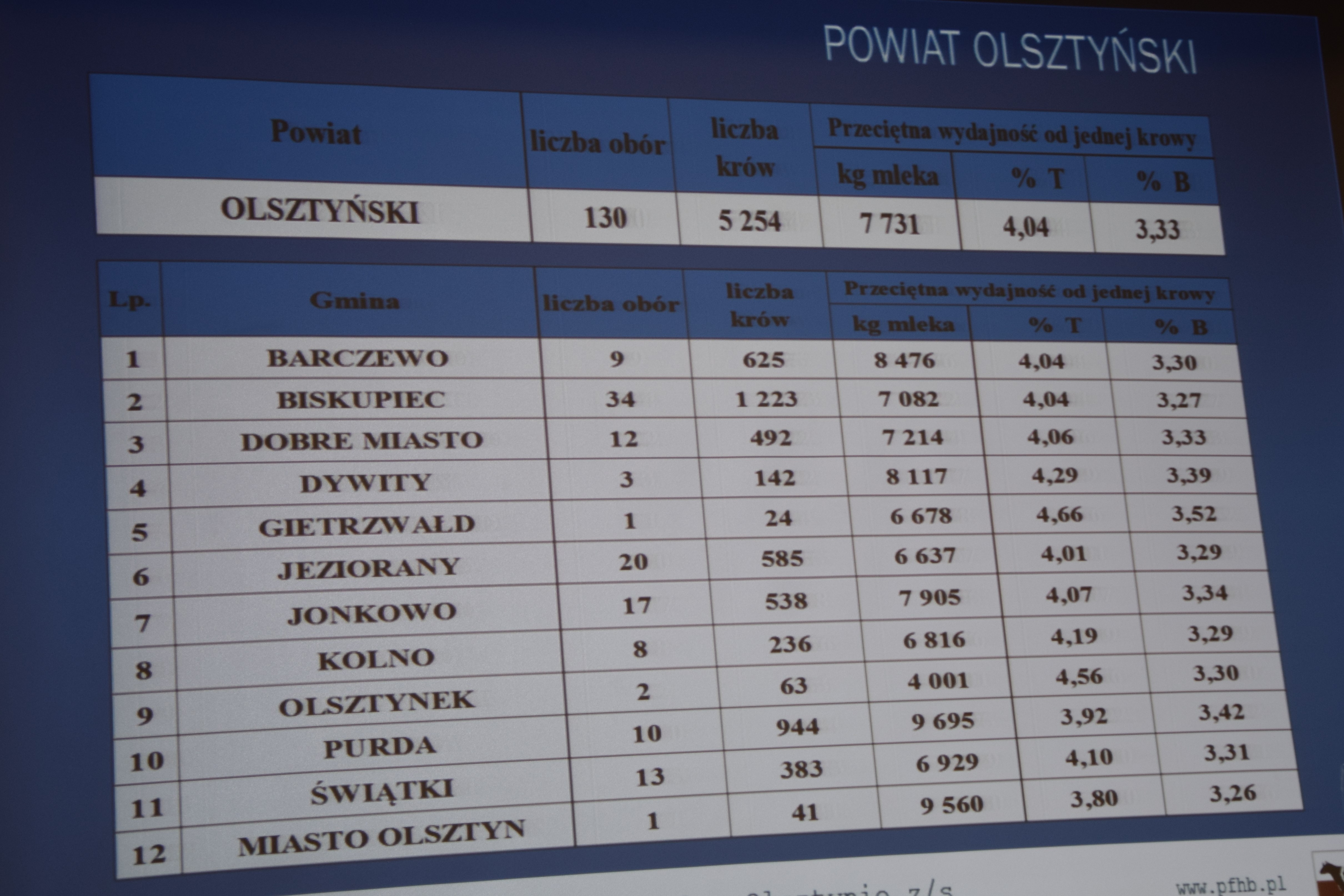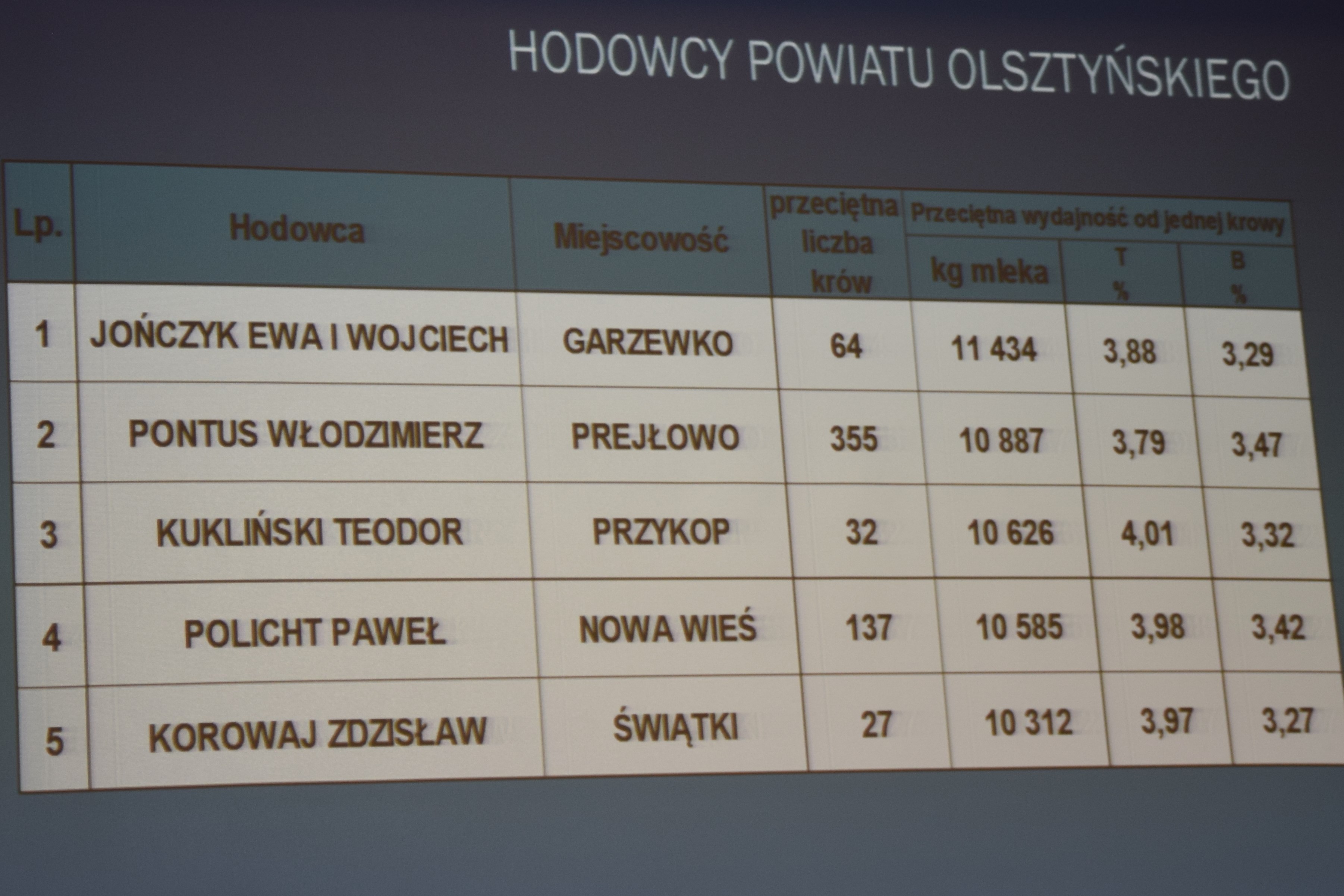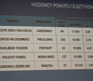 W powiecie olsztyńskim w 2018 r. ocenie poddano 5254 krowy w 130 oborach. Wśród hodowców najlepsze wyniki osiągnęli: Ewa i Wojciech Jończyk (Garzewko), Włodzimierz Pontus (Prejłowo), Teodor Kukliński (Przykop), Paweł Policht (Nowa Wieś) i Zdzisław Korowaj (Świątki). Listy gratulacyjne oraz upominki wręczył im Jacek Szydło, przedstawiciel Zarządu Powiatu. -