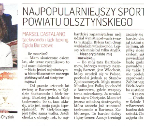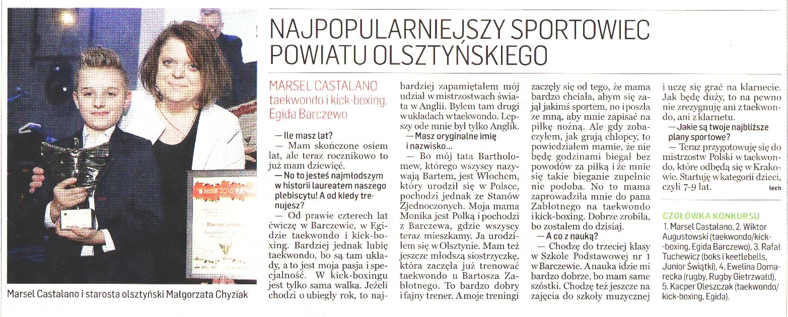 8-letni Marsel Castalano, trenujący teakwondo i kick-boxing w klubie Egida Barczewo, zdobył tytuł Najpopularniejszego Sportowca Powiatu Olsztyńskiego w 56. plebiscycie Gazety Olsztyńskiej. Podczas Balu Sportowca, który odbył się 25 lutego, nagrodę wręczyła mu starosta olsztyński Małgorzata Chyziak.