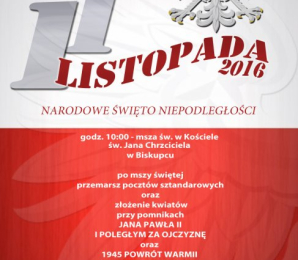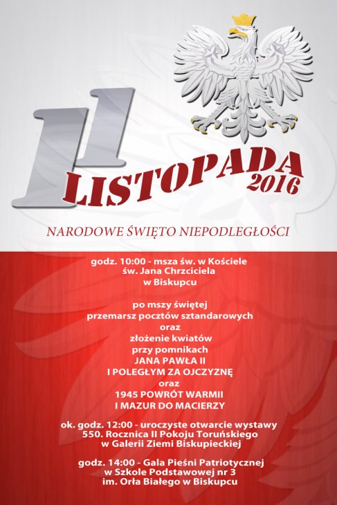 Gmina Biskupiec zaprasza w piątek 11 listopada na Narodowe Święto Niepodległości. Uroczystość rozpocznie msza św. w Kościele św. Jana Chrzciciela w Biskupcu.