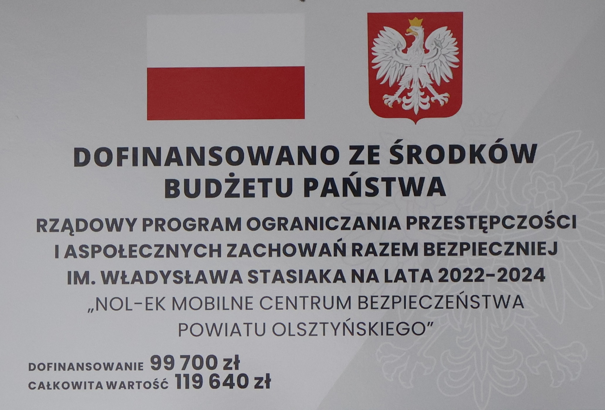 NOL-ek, czyli mobilne centrum bezpieczeństwa powiatu olsztyńskiego jest realizowany w ramach konkursu MSWiA "Razem bezpieczniej" im. Władysława Stasiaka. Koszt projektu wyniósł prawie 120 tys. zł, w tym dofinansowanie MSWiA to kwota 99,7 tys. zł, a wkład własny Powiatu Olsztyńskiego - blisko 20 tys. zł.
